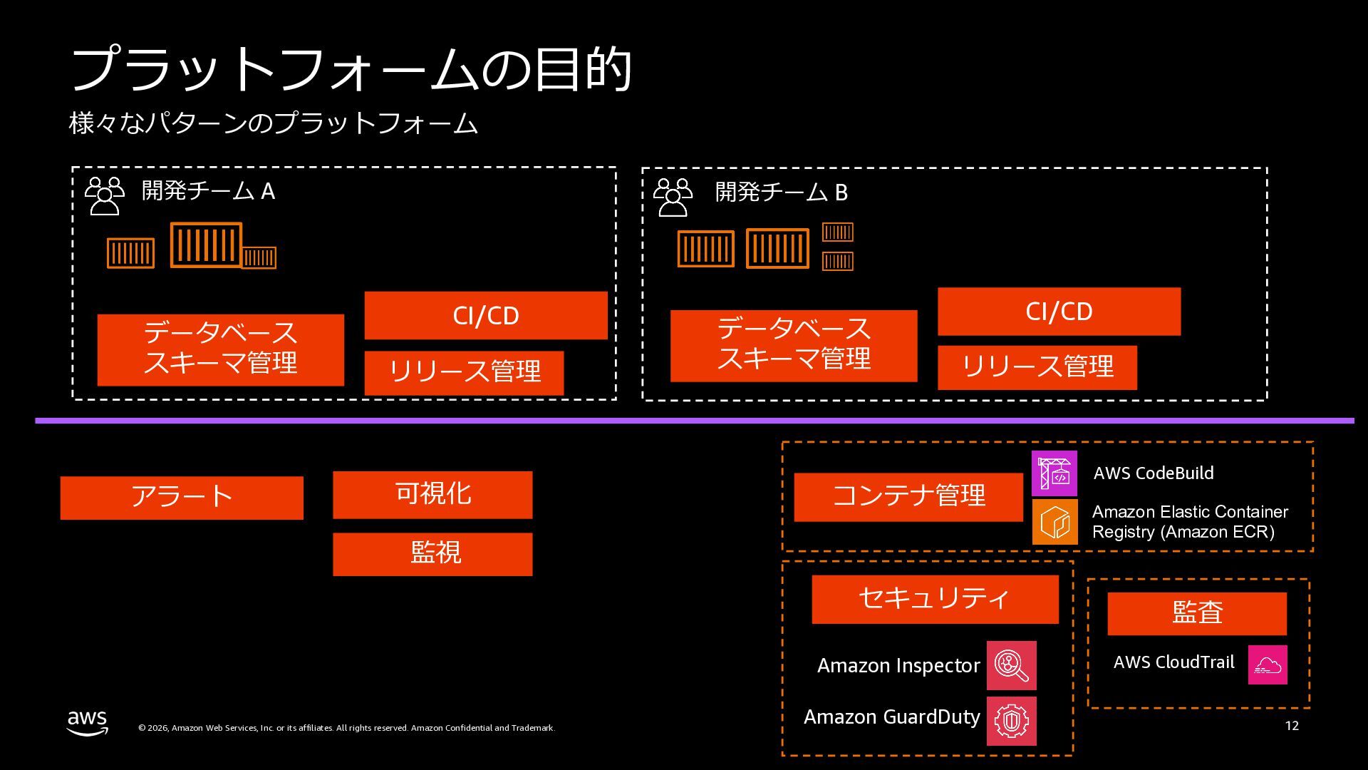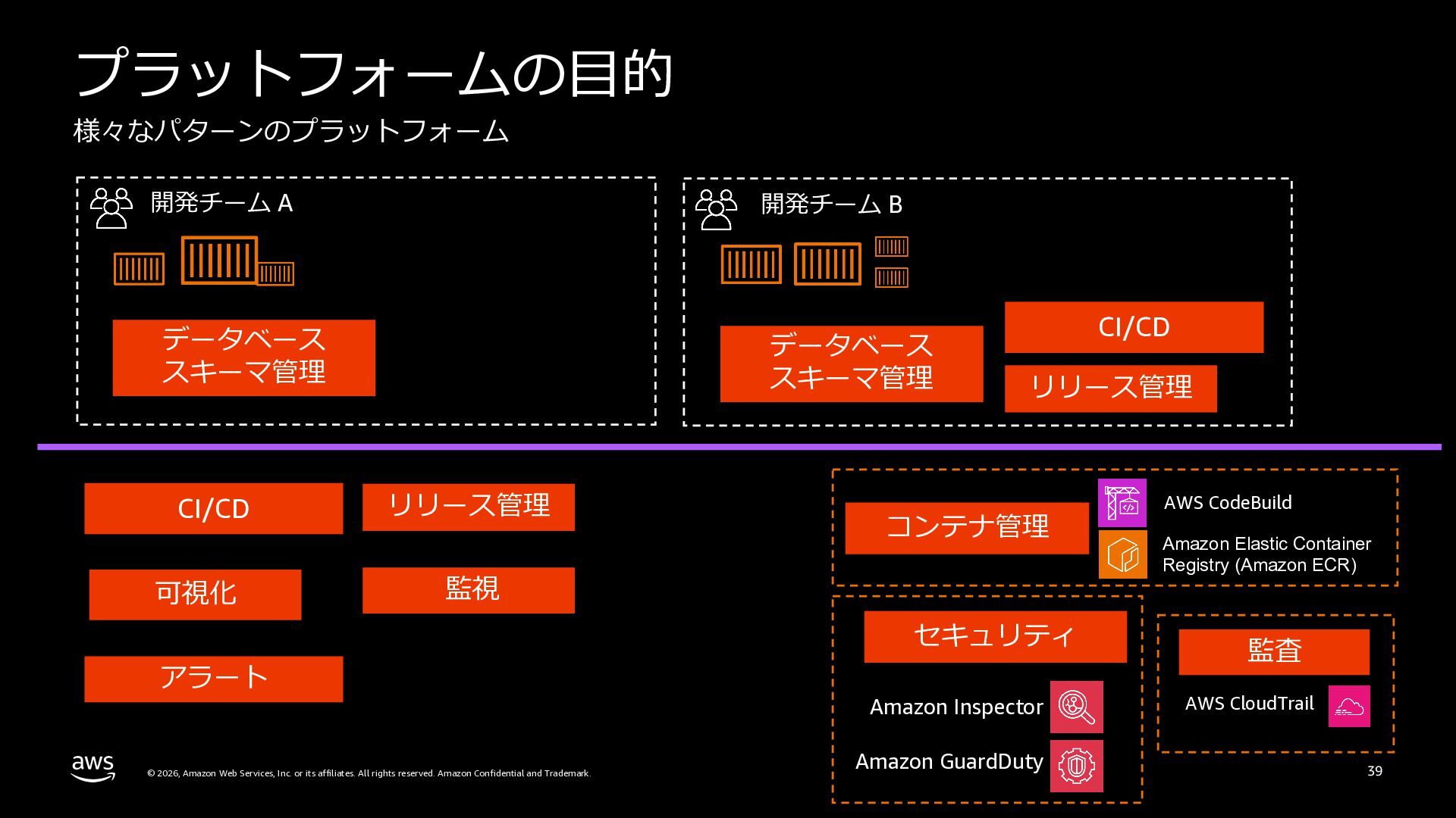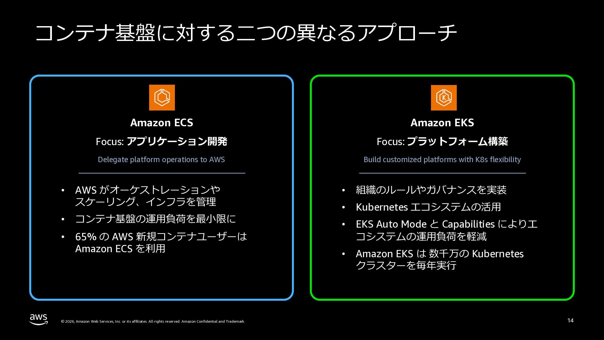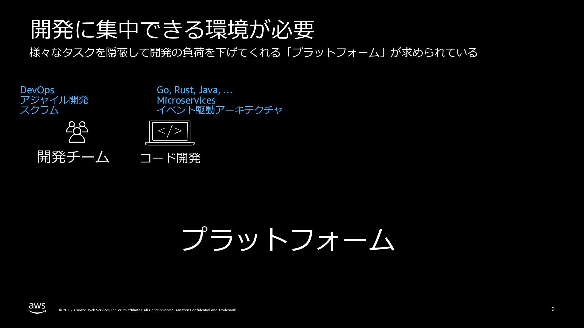本セッションでは、プラットフォームエンジニアリングの背景と目的を整理した上で、Amazon ECSによるクラウドネイティブなプラットフォームと、Amazon EKSによるKubernetesベースのプラットフォームという2つのアプローチを比較します。