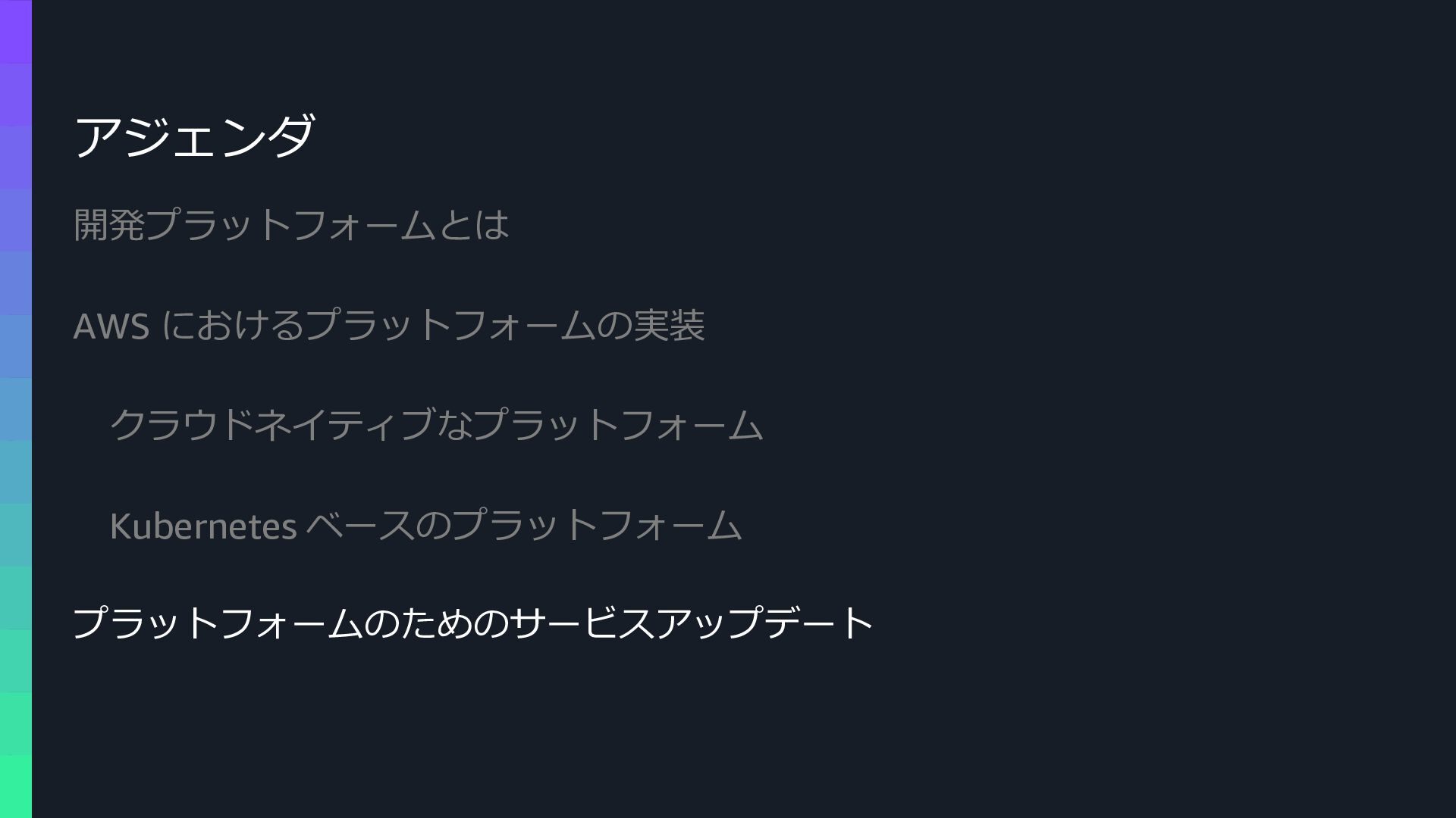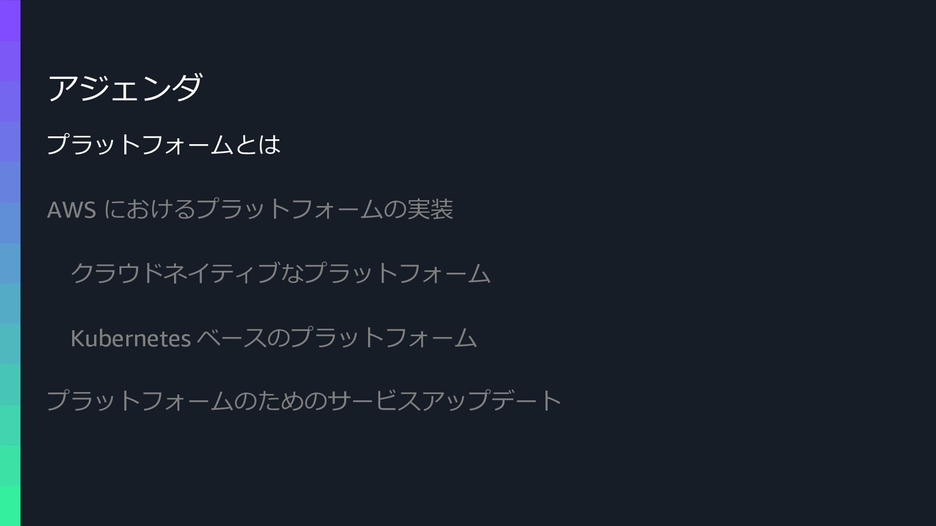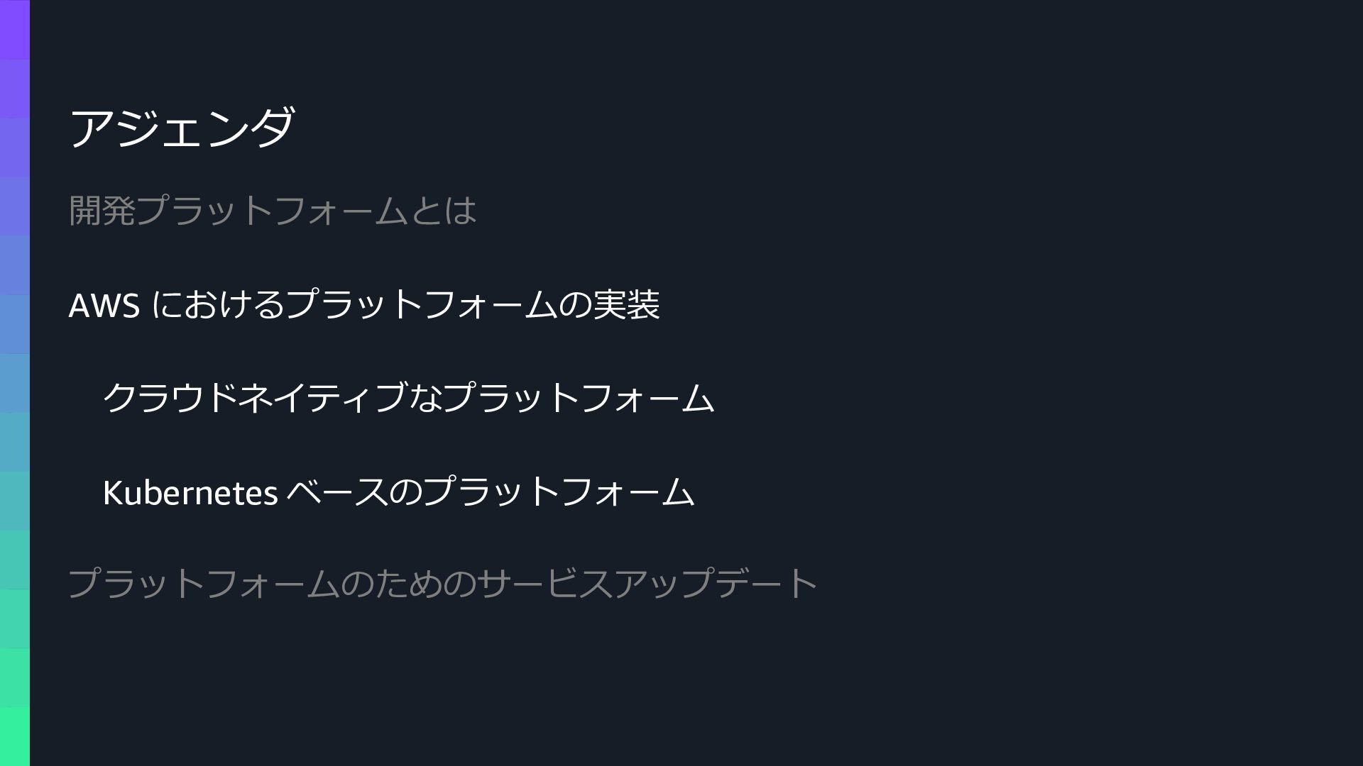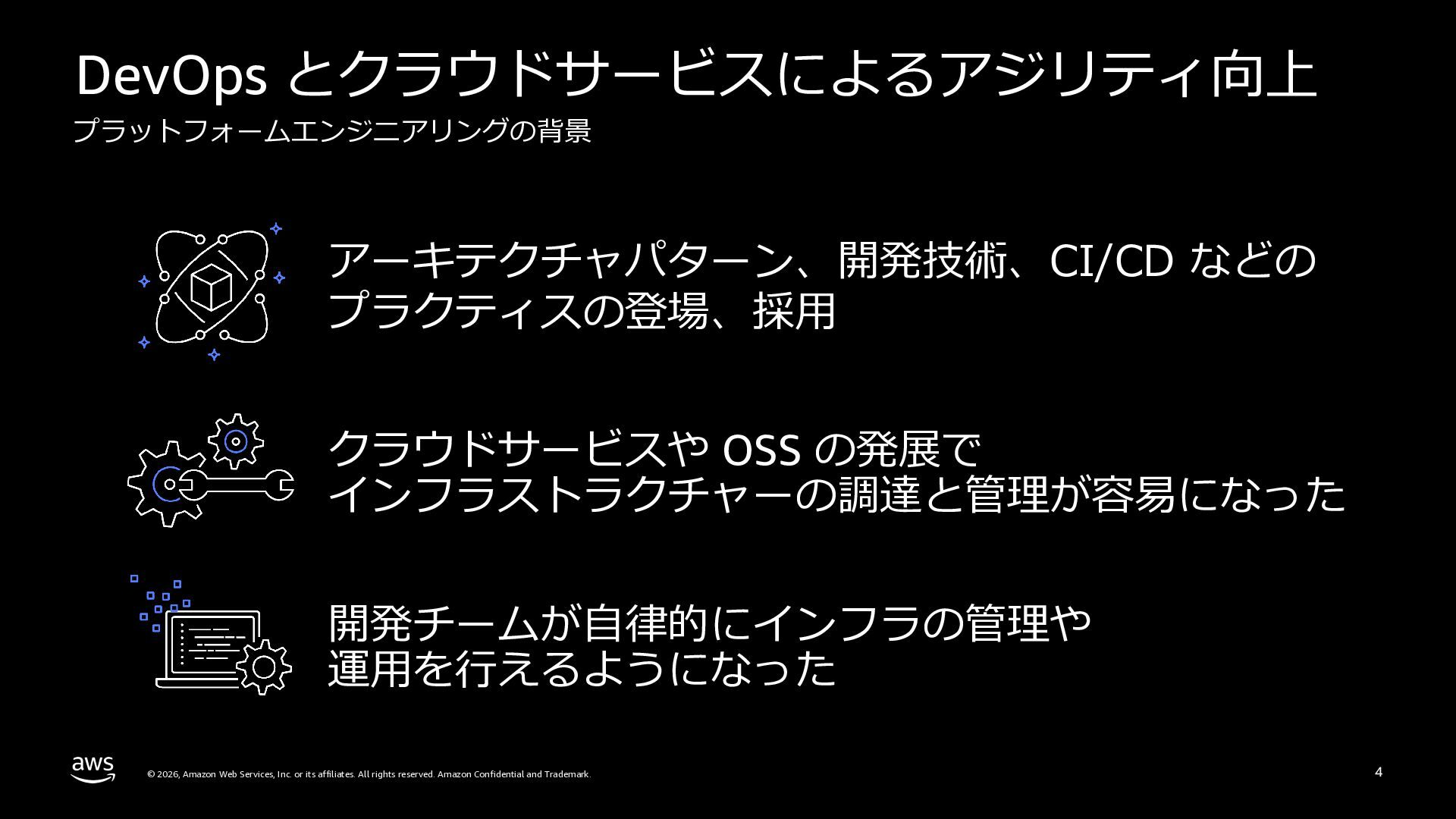 本セッションでは、プラットフォームエンジニアリングの背景と目的を整理した上で、Amazon ECSによるクラウドネイティブなプラットフォームと、Amazon EKSによるKubernetesベースのプラットフォームという2つのアプローチを比較します。