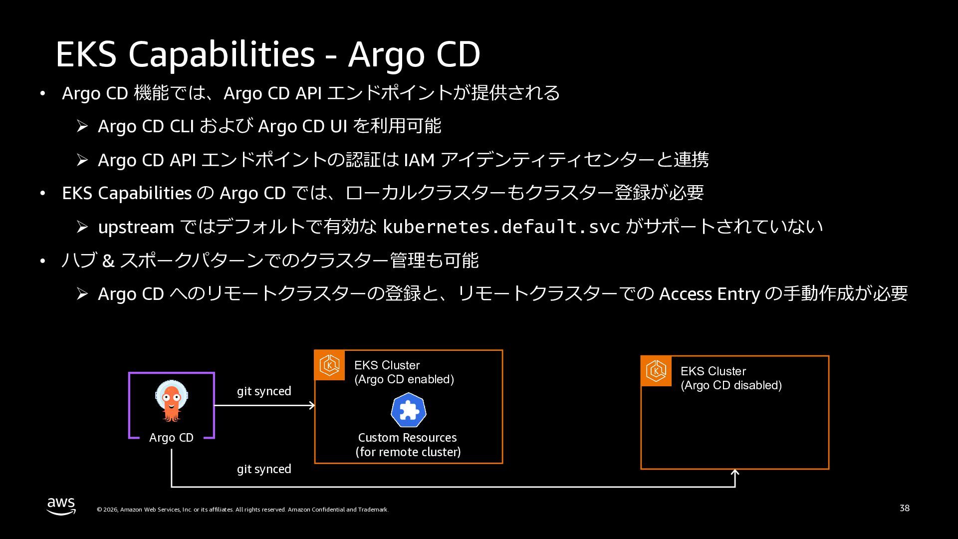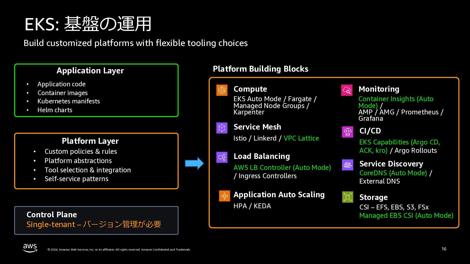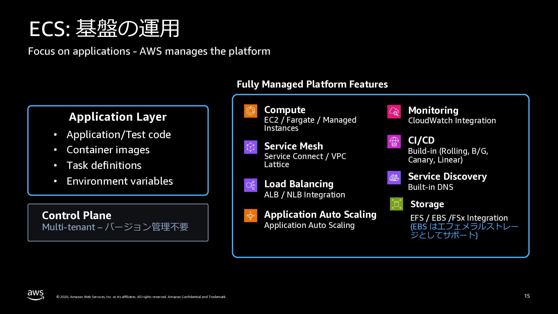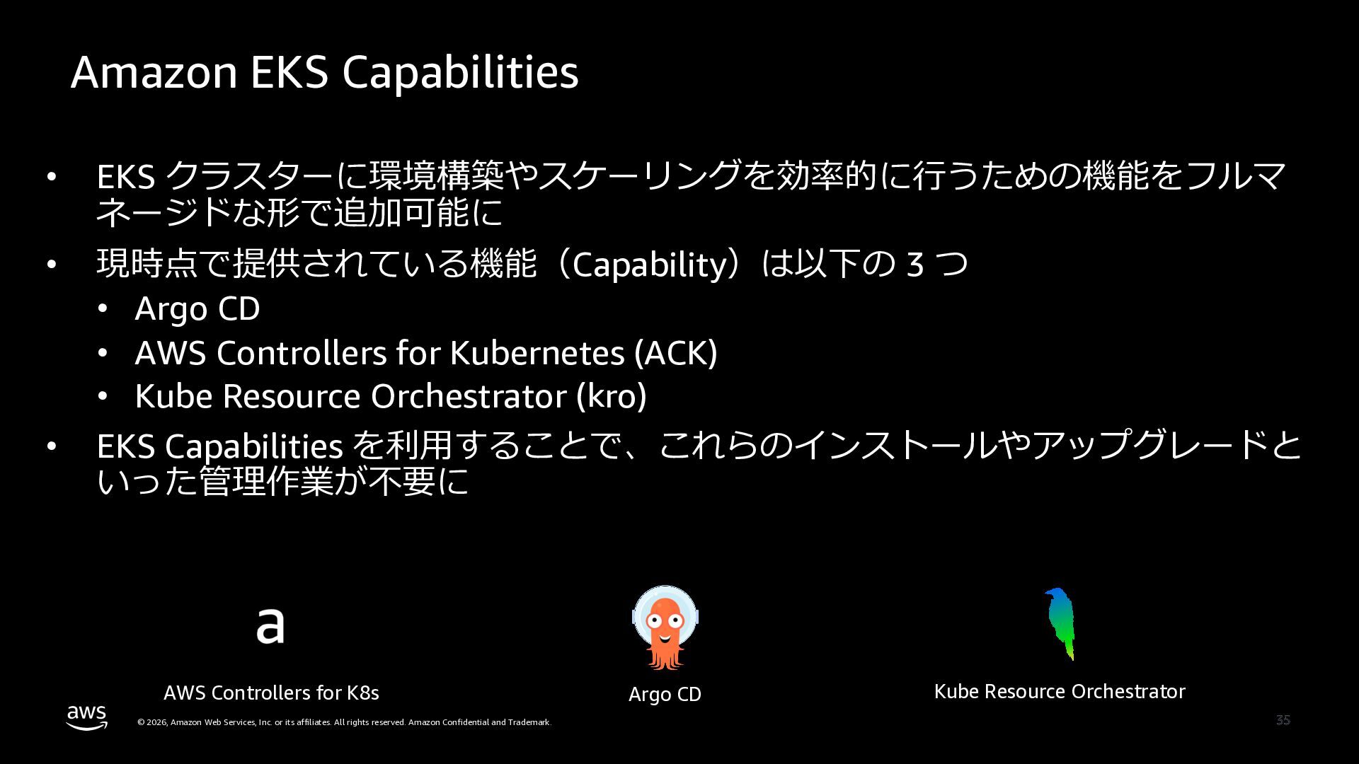 さらに、ECS Managed Instances、リソース最適化、Canary/リニアデプロイといったECSの最新アップデートや、EKS Auto Mode、EC2マネージドインスタンス、EKS Capabilitiesを通じたArgo CD・ACK・kroの統合管理など、プラットフォーム運用負荷を軽減するサービスアップデートを紹介します。