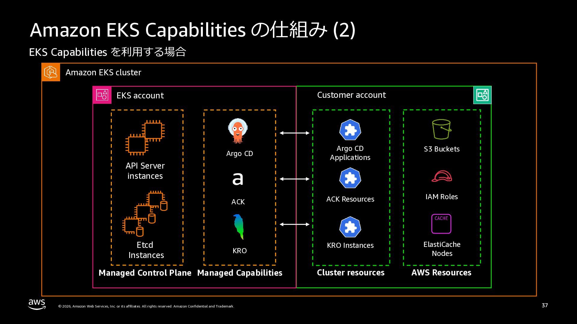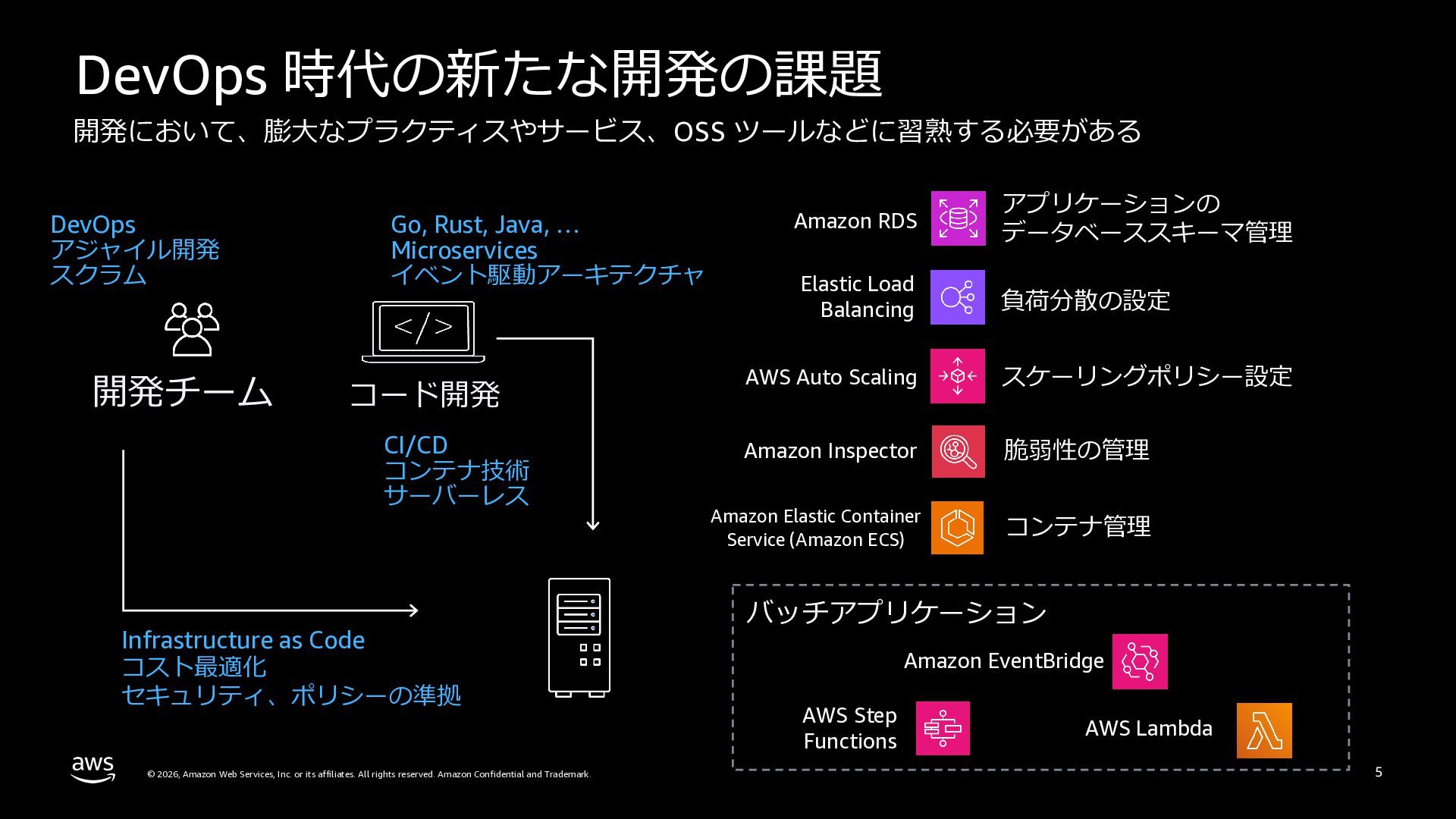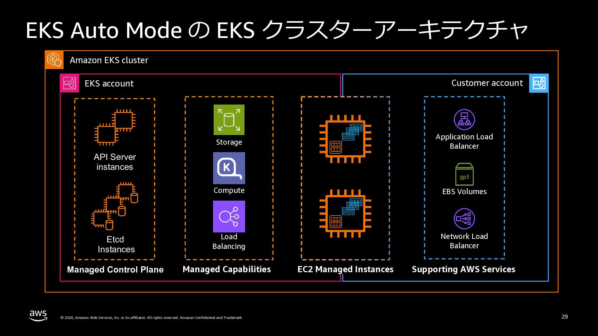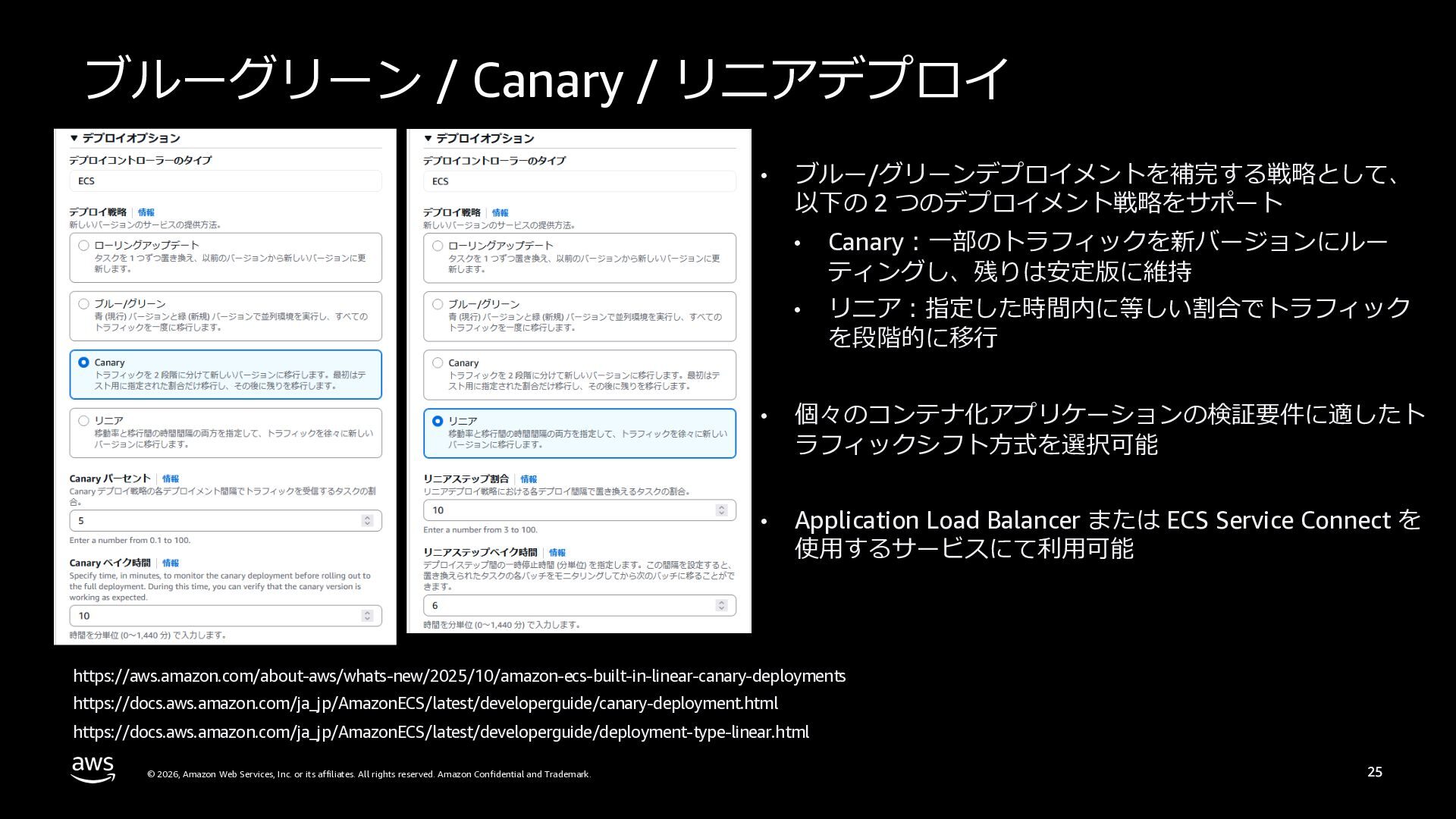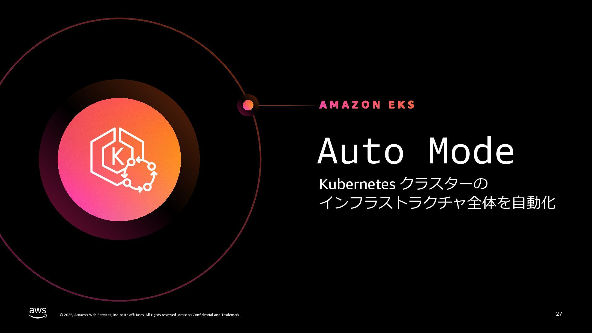 さらに、ECS Managed Instances、リソース最適化、Canary/リニアデプロイといったECSの最新アップデートや、EKS Auto Mode、EC2マネージドインスタンス、EKS Capabilitiesを通じたArgo CD・ACK・kroの統合管理など、プラットフォーム運用負荷を軽減するサービスアップデートを紹介します。