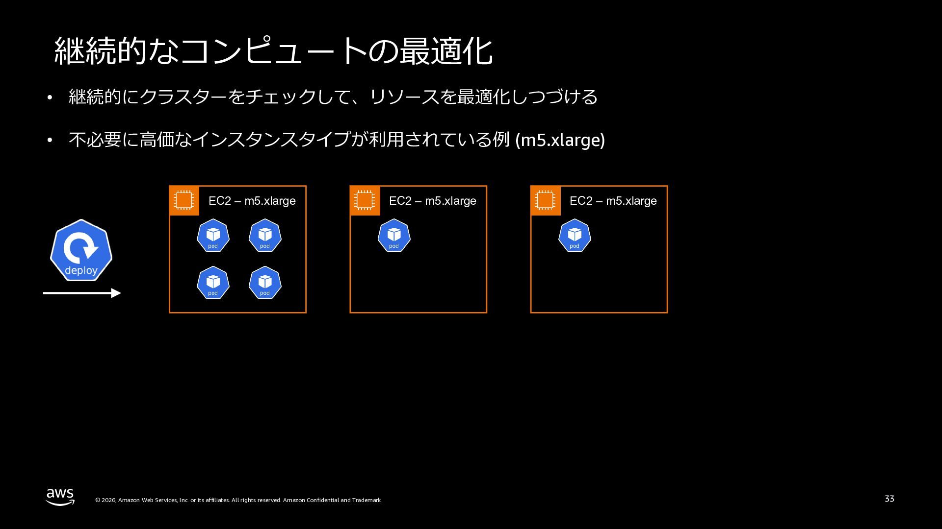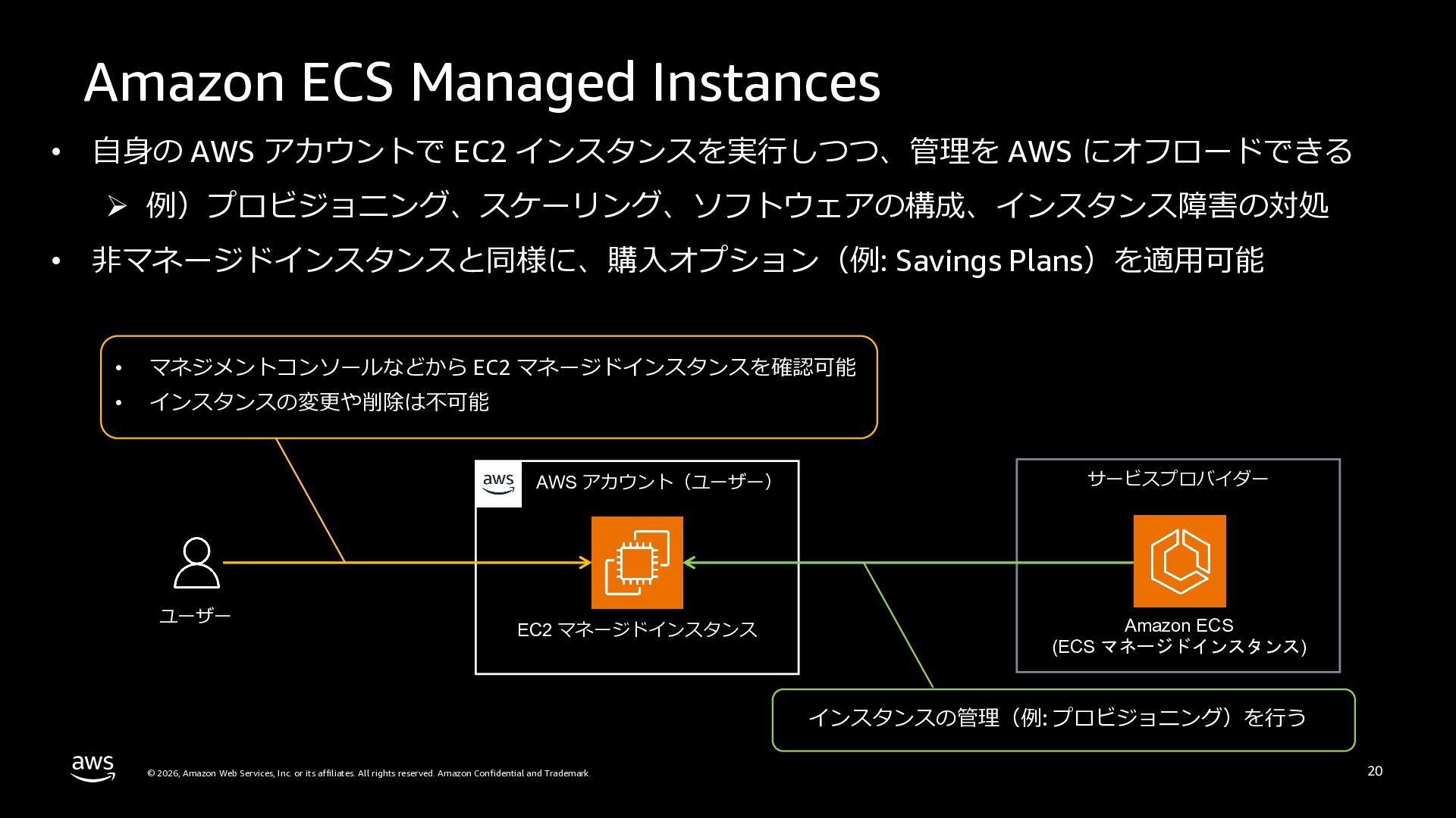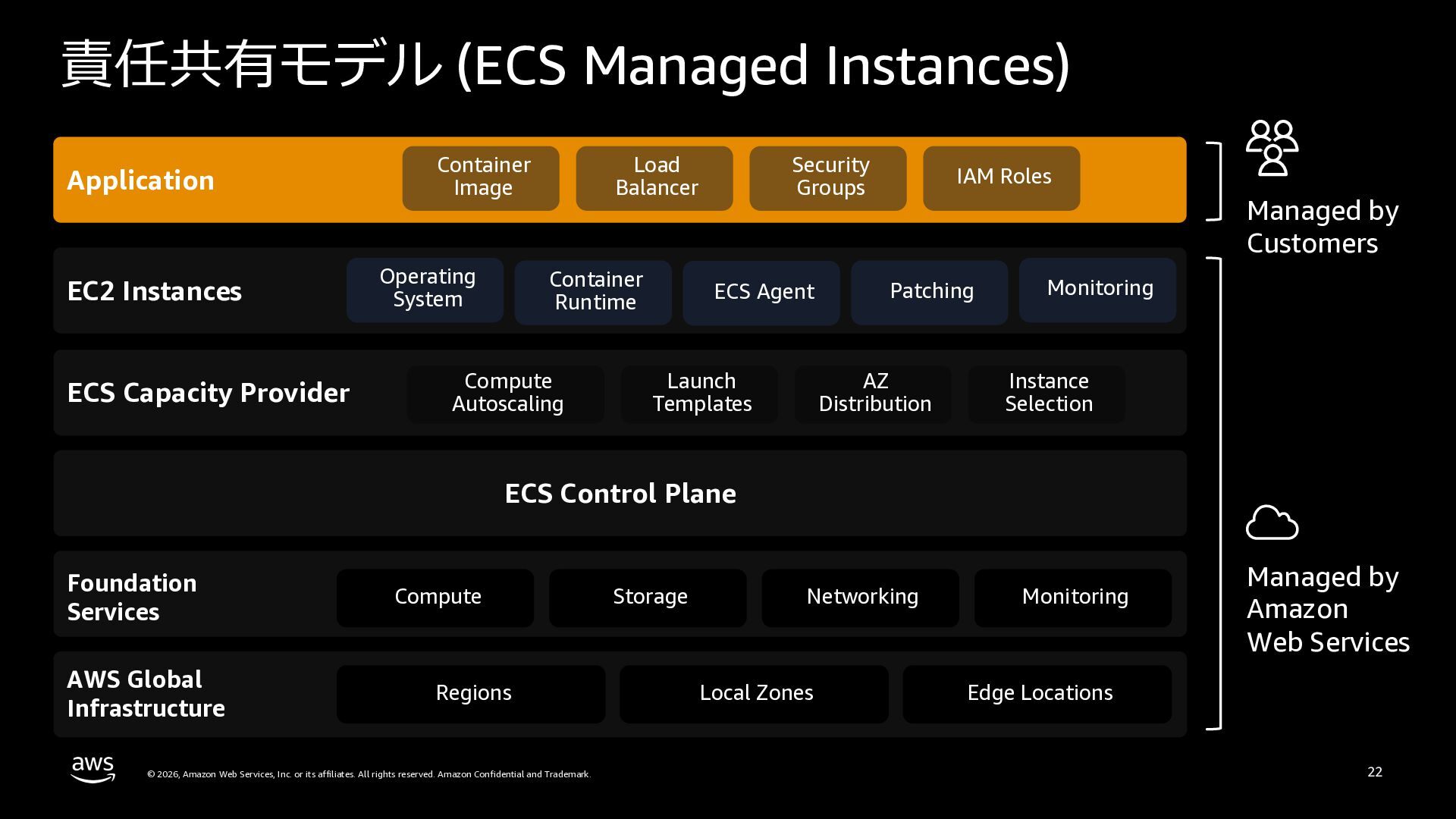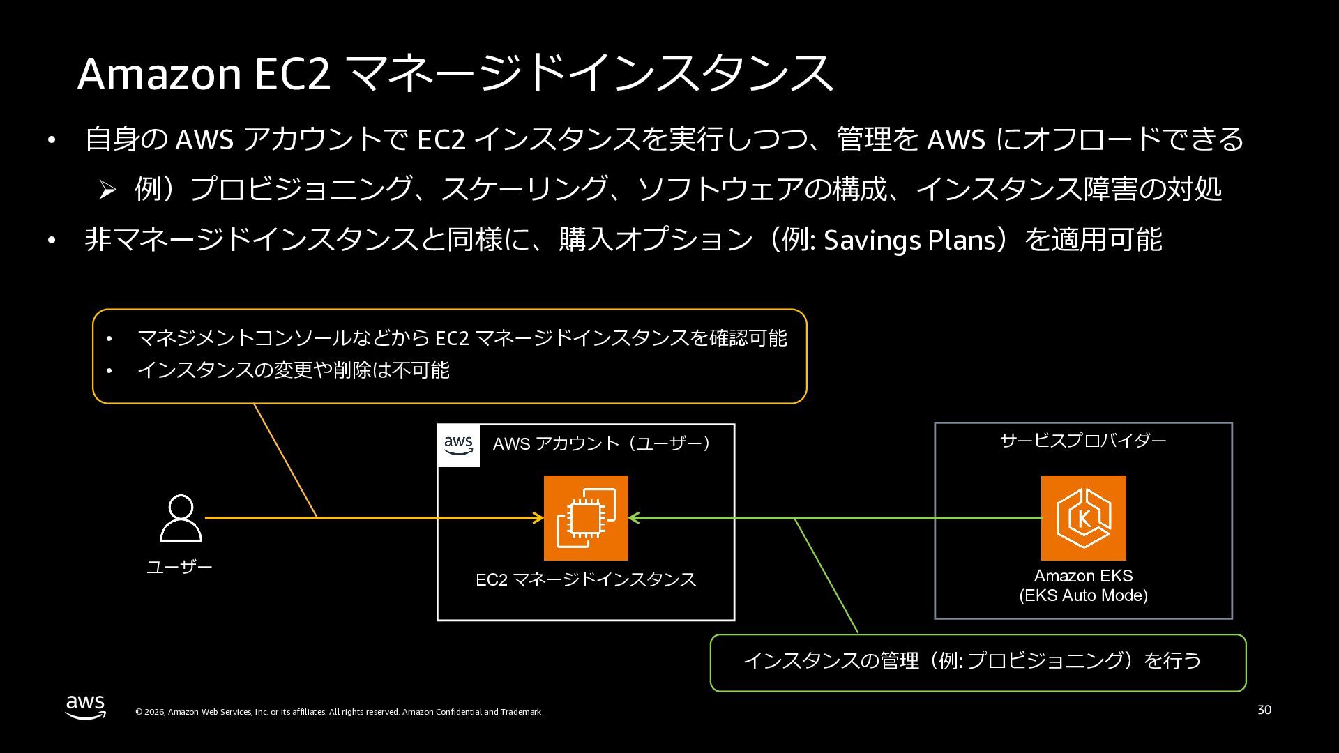 さらに、ECS Managed Instances、リソース最適化、Canary/リニアデプロイといったECSの最新アップデートや、EKS Auto Mode、EC2マネージドインスタンス、EKS Capabilitiesを通じたArgo CD・ACK・kroの統合管理など、プラットフォーム運用負荷を軽減するサービスアップデートを紹介します。