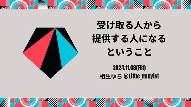 タイトルテキスト 受け取る⼈から 提供する⼈になる ということ 2024.11.08(FRI) 相⽣ゆら @Little_Rubyist