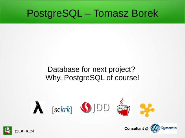 This talk highlights nice sides of Postgres which IMO make it an excellent choice for your next project - aside from money. I'm talking about NoSQL support, datatypes, logging, error handling, procedures in languages devs know as well as about Postgres internals: it's query path, architecture and processes.