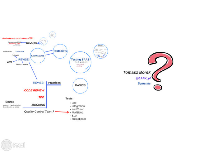 Short distillation of my experiences after 4 years of working on large SAAS HR solution provider, in various roles. In this talk I detailed what worked, why, what didn't and also why. Focused on testing practices and what to do to have your own SAAS testable.