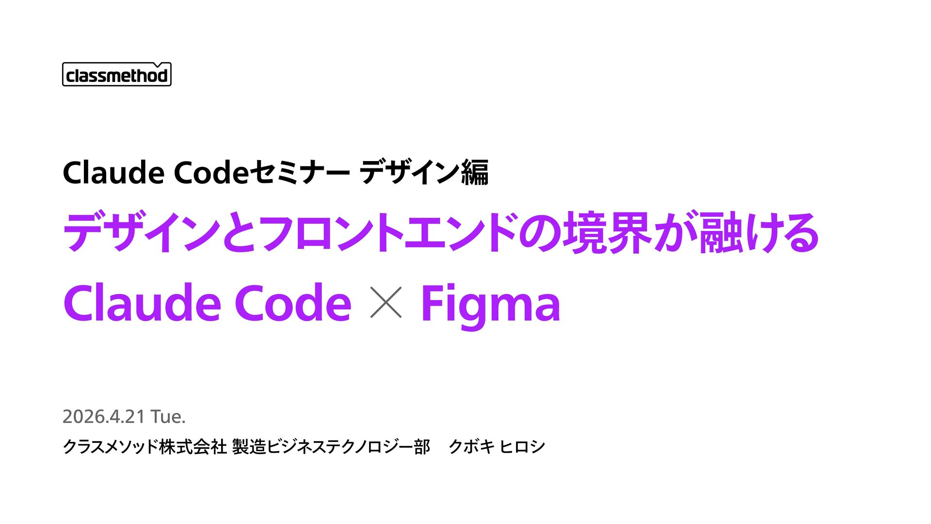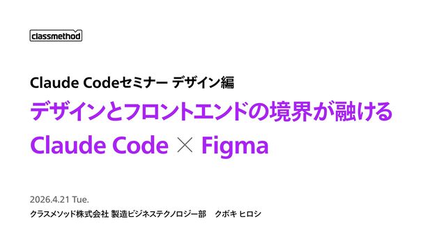Claude Codeセミナー デザイン編 デザインとフロントエンドの境界が融ける Claude Code Figma 2026.4.21 Tue. クラスメソッド株式会社
