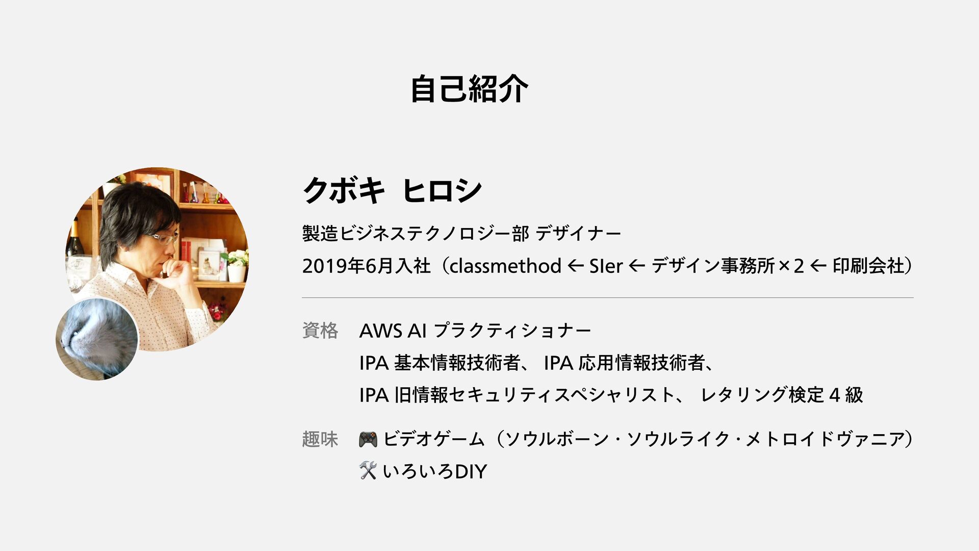 自己紹介 クボキ ヒロシ 製造ビジネステクノロジー部 デザイナー 2019年6月入社(classmethod ← SIer ← デザイン事務所×2