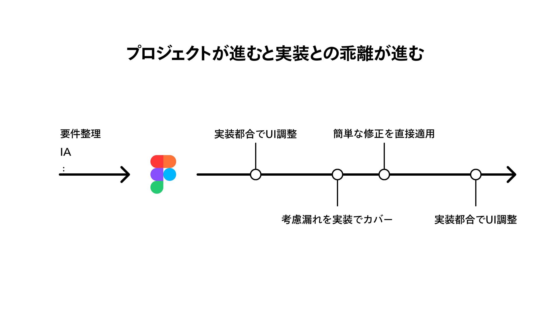 要件整理 IA ⋮ プロジェクトが進むと実装との乖離が進む 簡単な修正を直接適用 実装都合でUI調整 考慮漏れを実装でカバー 実装都合でUI調整