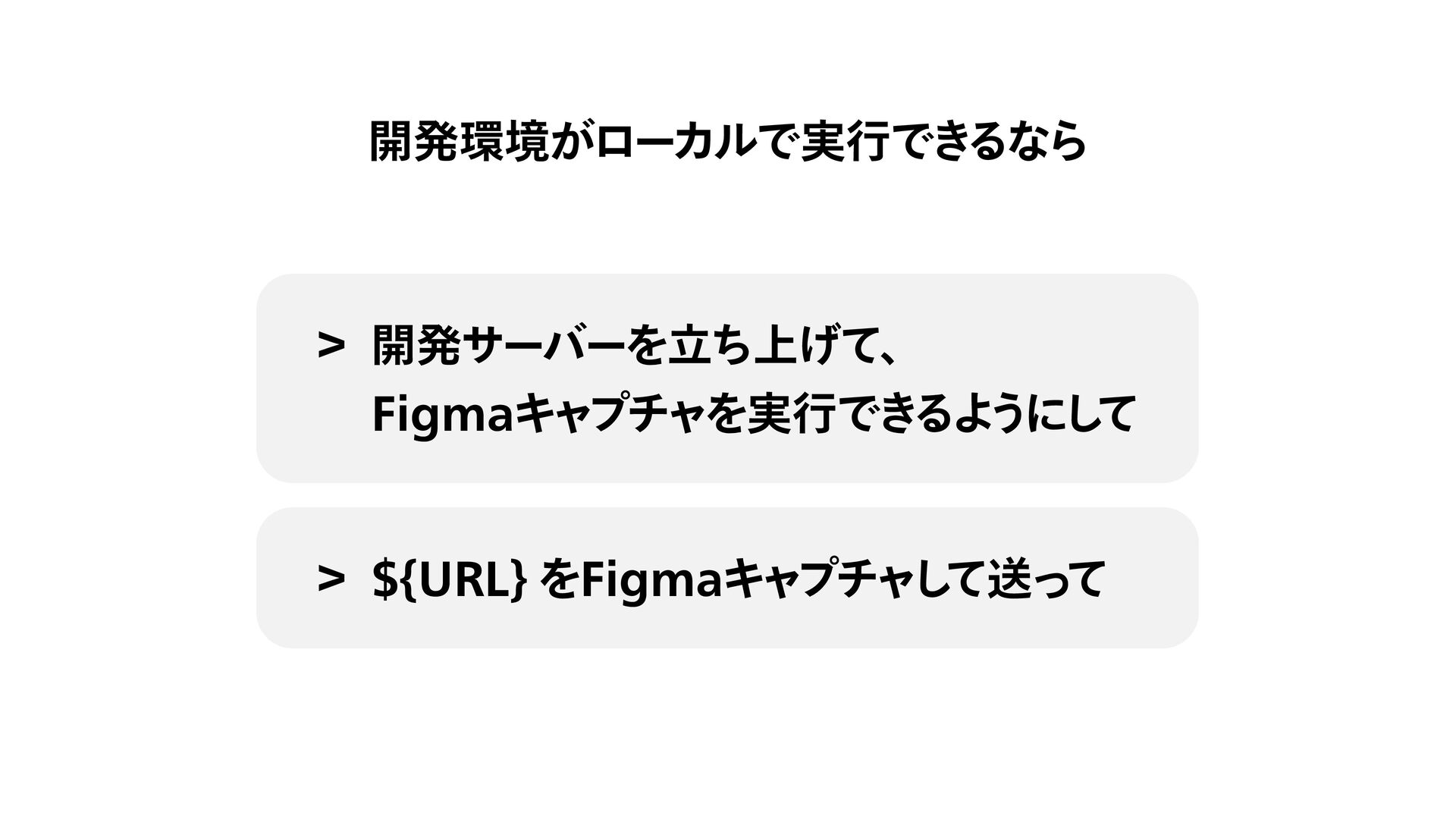 開発環境がローカルで実行できるなら > 開発サーバーを立ち上げて、 Figmaキャプチャを実行できるようにして > ${URL} をFigmaキャプチャして送って