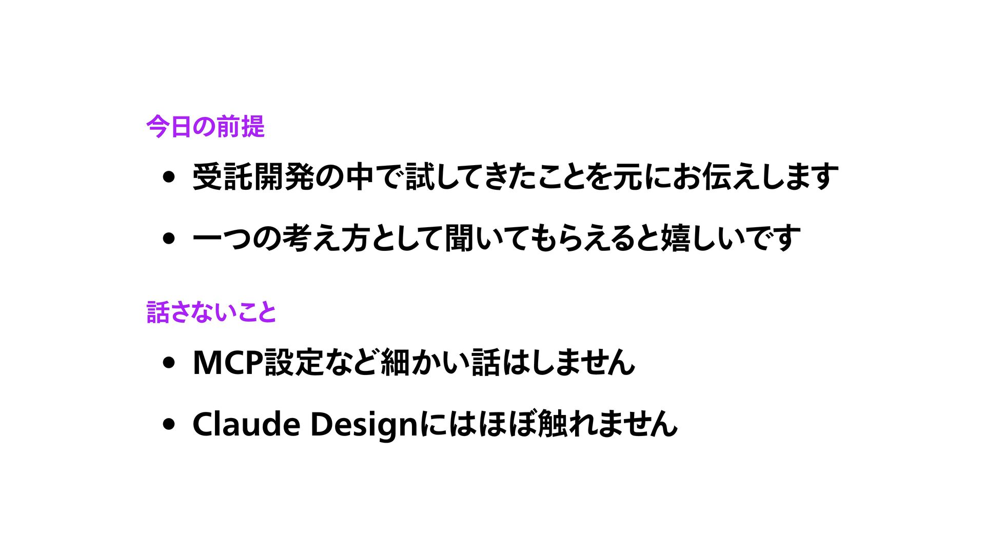今日の前提 受託開発の中で試してきたことを元にお伝えします 一つの考え方として聞いてもらえると嬉しいです 話さないこと MCP設定など細かい話はしません Claude Designにはほぼ触れません