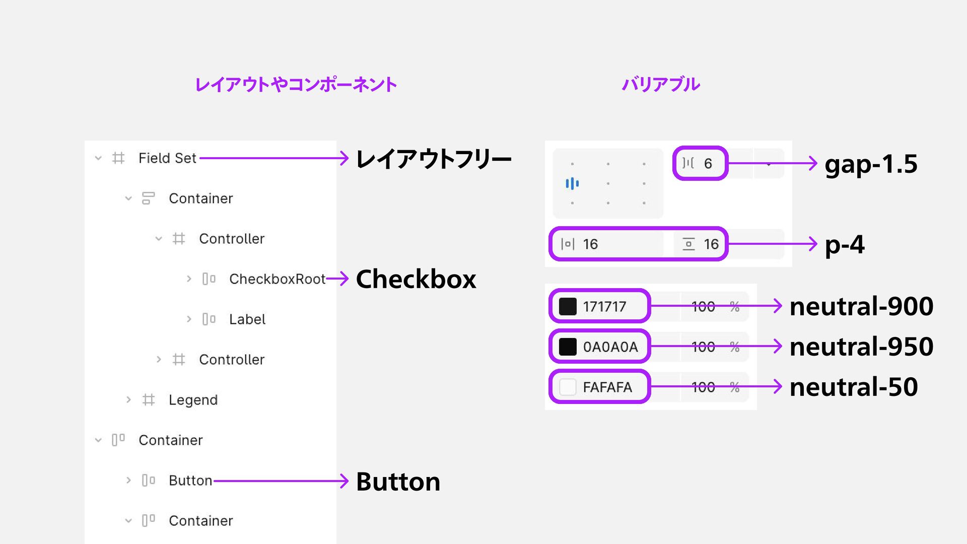 レイアウ トやコンポーネント レイアウ トフリー Checkbox Button バリアブル gap-1.5 p-4 neutral-900