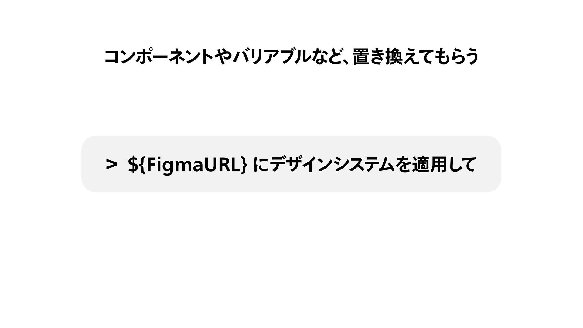 コンポーネントやバリアブルなど、 置き換えてもらう > ${FigmaURL} にデザインシステムを適用して
