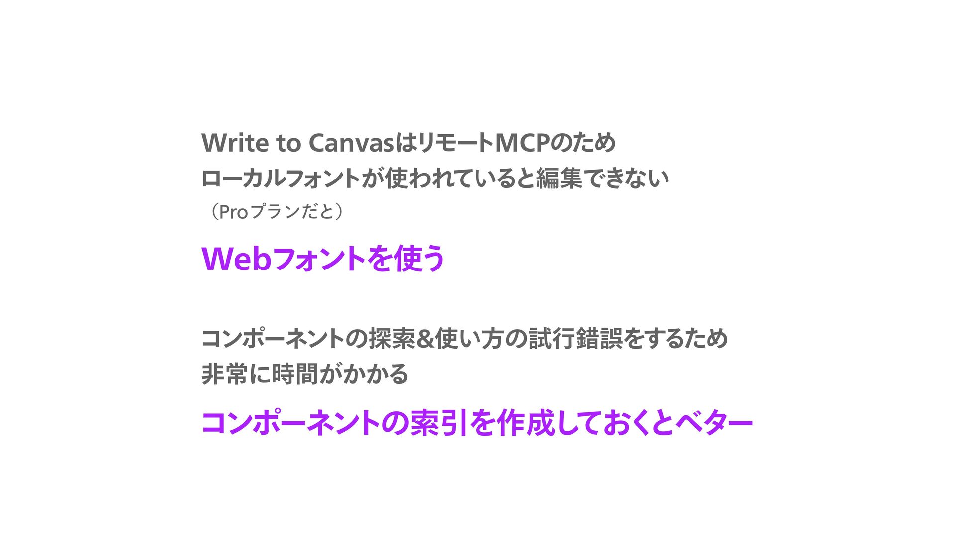 Write to CanvasはリモートMCPのため ローカルフォントが使われていると編集できない (Proプランだと) Webフォントを使う コンポーネントの探索&使い方の試行錯誤をするため 非常に時間がかかる コンポーネントの索引を作成しておくとベター