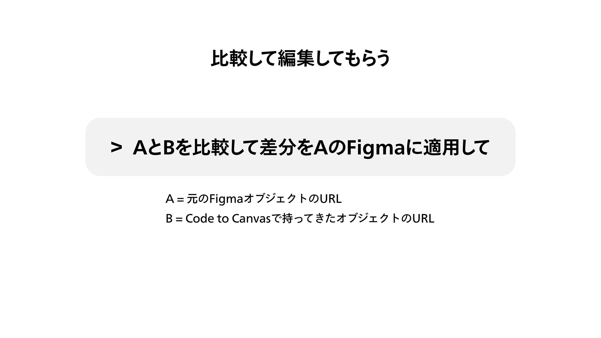 比較して編集してもらう > AとBを比較して差分をAのFigmaに適用して A = 元のFigmaオブジェクトのURL B = Code to