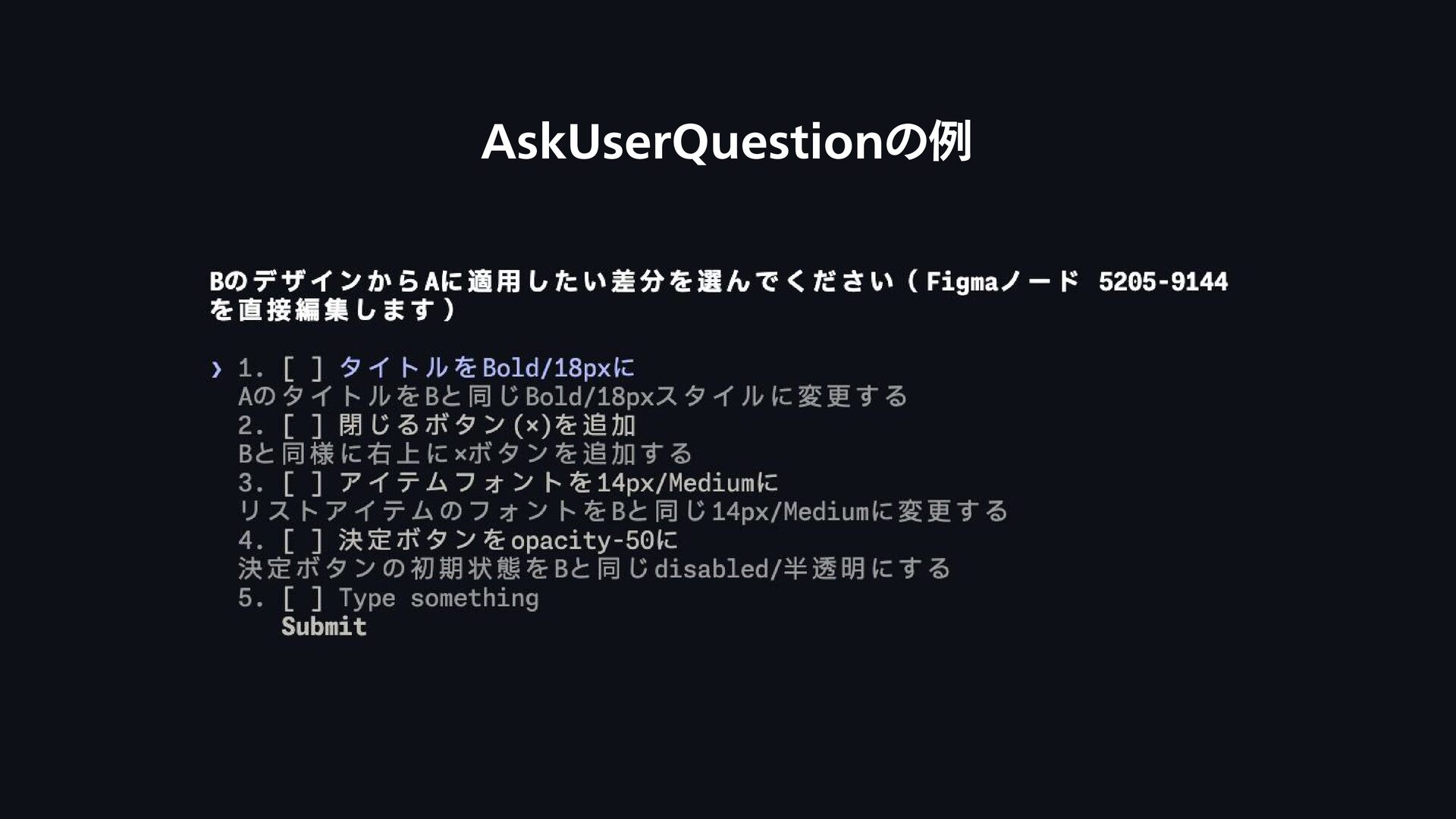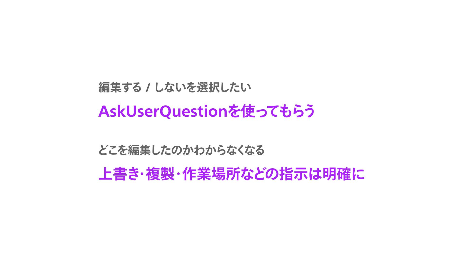 編集する / しないを選択したい AskUserQuestionを使ってもらう どこを編集したのかわからなくなる 上書き ・複製・作業場所などの指示は明確に