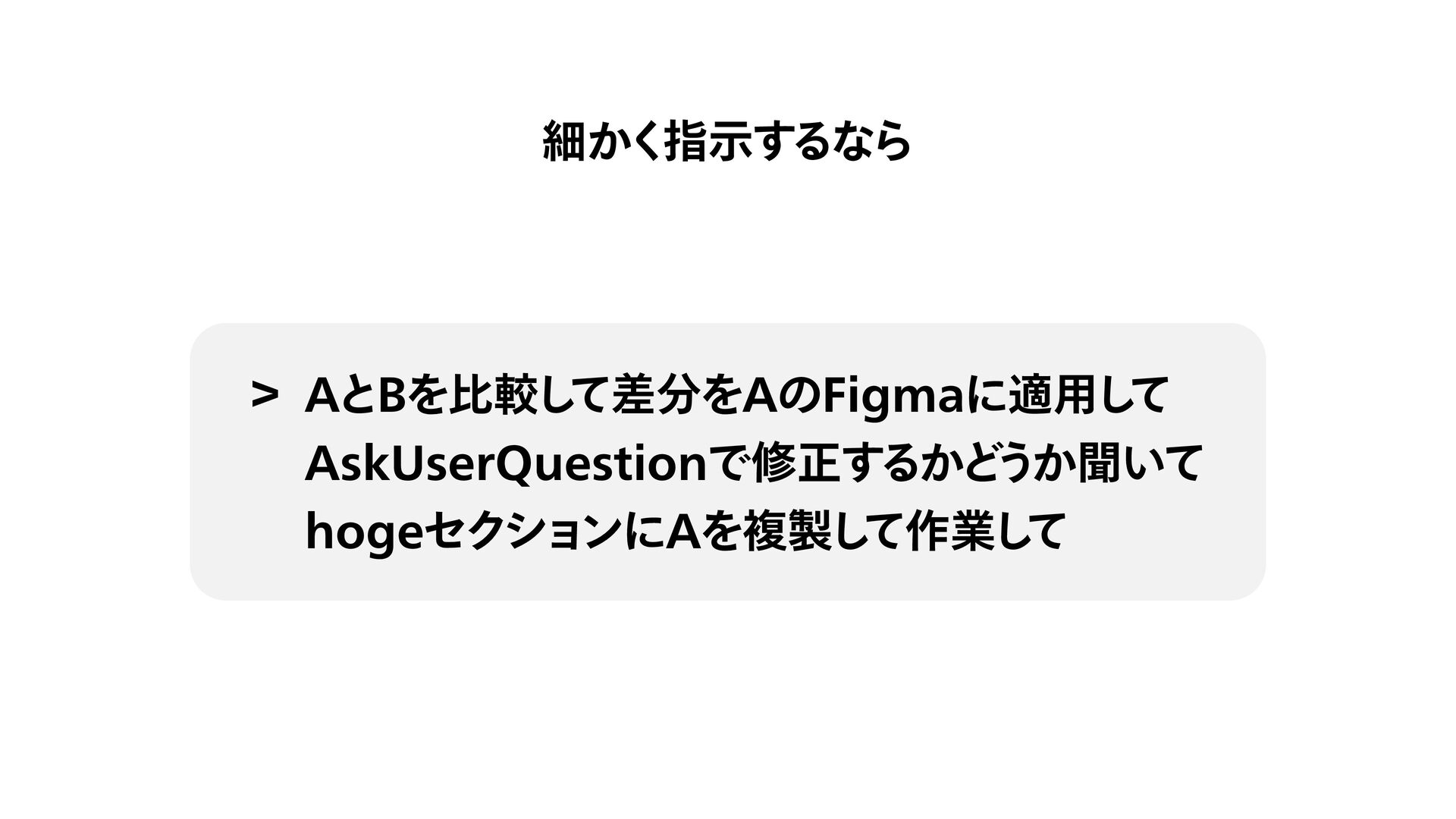 細かく指示するなら > AとBを比較して差分をAのFigmaに適用して AskUserQuestionで修正するかどうか聞いて hogeセクションにAを複製して作業して