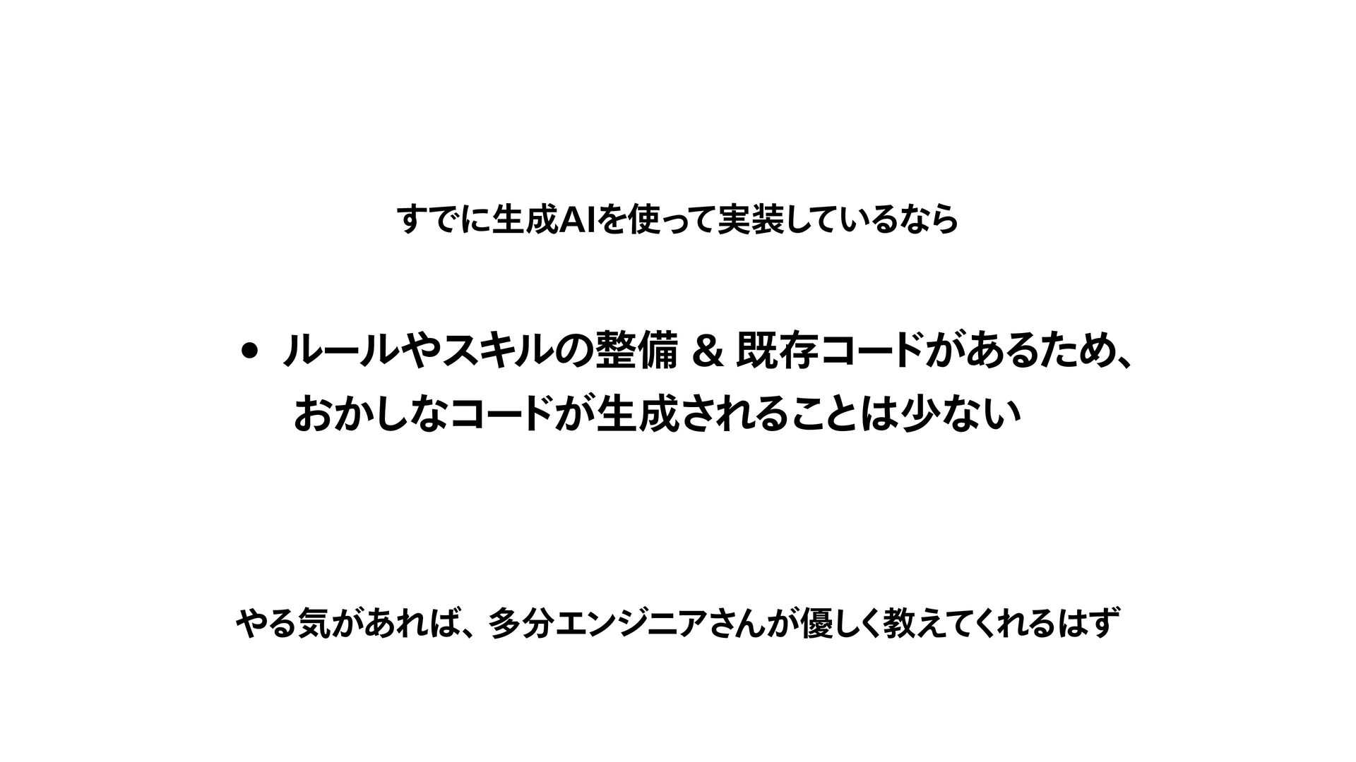 すでに生成AIを使って実装しているなら ルールやスキルの整備 & 既存コードがあるため、 おかしなコードが生成されることは少ない やる気があれば、 多分エンジニアさんが優しく教えてくれるはず