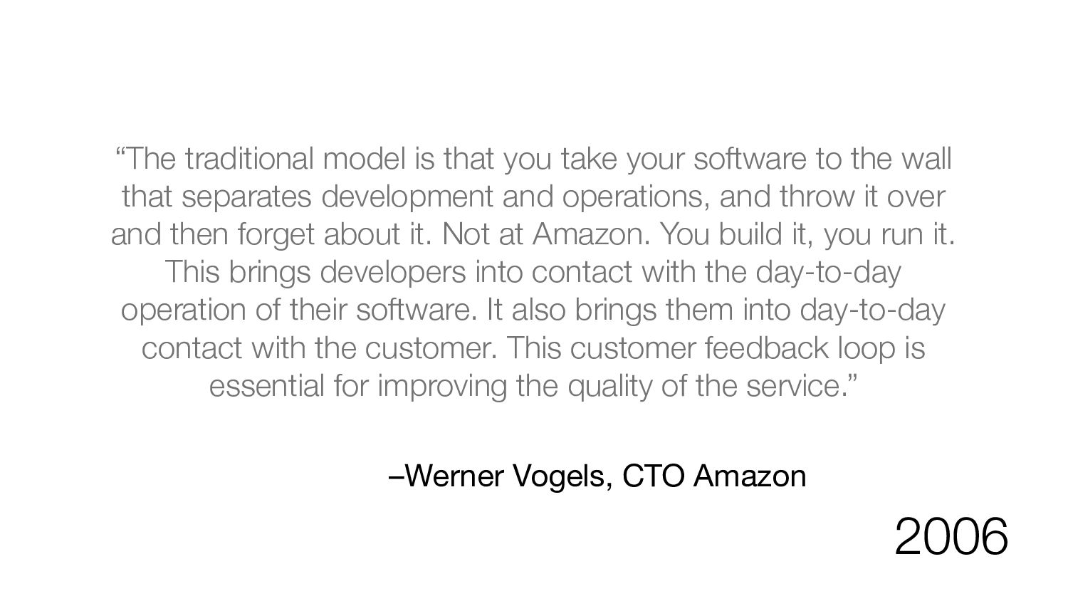 take your software to the wall that separates development and operations, and throw it over and then forget about it. Not at Amazon. You build it, you run it. This brings developers into contact with the day-to-day operation of their software. It also brings them into day-to-day contact with the customer. This customer feedback loop is essential for improving the quality of the service.” 2006