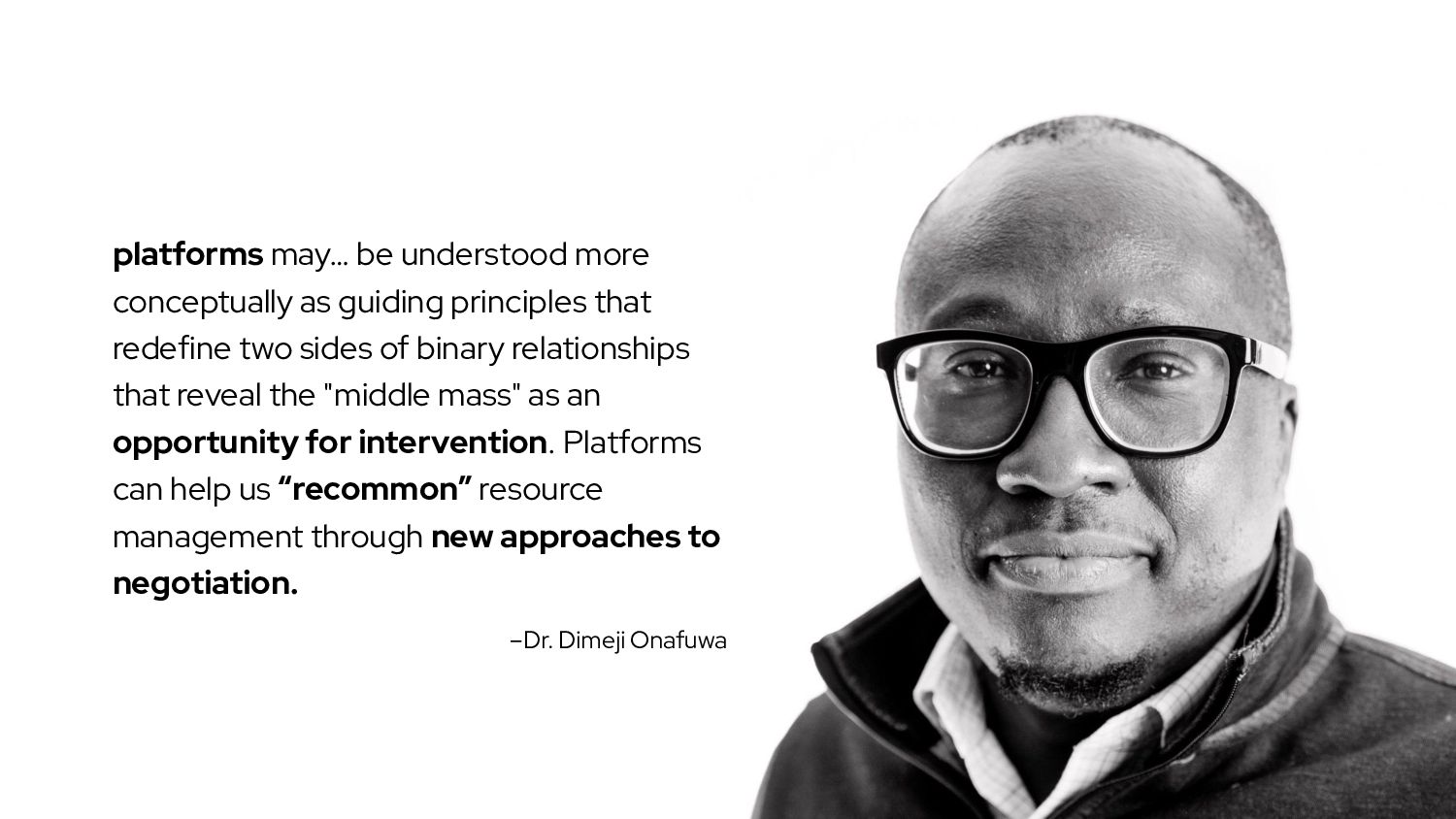 that redefine two sides of binary relationships that reveal the "middle mass" as an opportunity for intervention. Platforms can help us “recommon” resource management through new approaches to negotiation. –Dr. Dimeji Onafuwa