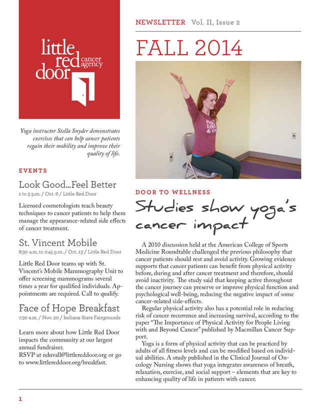 Hope Breakfast 7:30 a.m. / Nov. 20 / Indiana State Fairgrounds Learn more about how Little Red Door impacts the community at our largest annual fundraiser. RSVP at [email protected] or go to www.littlereddoor.org/breakfast. DOOR TO WELLNESS EVENTS A 2010 discussion held at the American College of Sports Medicine Roundtable challenged the previous philosophy that cancer patients should rest and avoid activity. Growing evidence supports that cancer patients can benefi t from physical activity before, during and after cancer treatment and therefore, should avoid inactivity. Th e study said that keeping active throughout the cancer journey can preserve or improve physical function and psychological well-being, reducing the negative impact of some cancer-related side-eff ects. Regular physical activity also has a potential role in reducing risk of cancer recurrence and increasing survival, according to the paper “Th e Importance of Physical Activity for People Living with and Beyond Cancer” published by Macmillan Cancer Sup- port. Yoga is a form of physical activity that can be practiced by adults of all fi tness levels and can be modifi ed based on individ- ual abilities. A study published in the Clinical Journal of On- cology Nursing shows that yoga integrates awareness of breath, relaxation, exercise, and social support – elements that are key to enhancing quality of life in patients with cancer. Studies show yoga’s cancer impact Yoga instructor Stella Snyder demonstrates exercises that can help cancer patients regain their mobility and improve their quality of life. St. Vincent Mobile 8:30 a.m. to 2:45 p.m. / Oct. 13 / Little Red Door Little Red Door teams up with St. Vincent’s Mobile Mammography Unit to off er screening mammograms several times a year for qualifi ed individuals. Ap- pointments are required. Call to qualify. Look Good...Feel Better 1 to 3 p.m. / Oct. 6 / Little Red Door Licensed cosmetologists teach beauty techniques to cancer patients to help them manage the appearance-related side eff ects of cancer treatment.