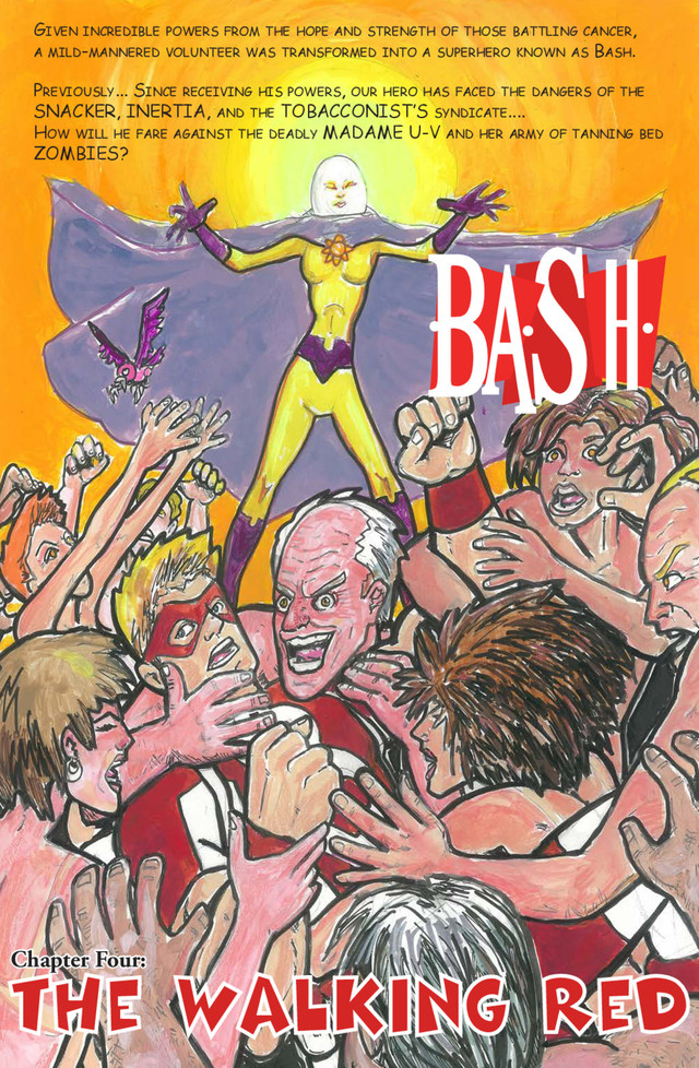 strength of those battling cancer, a mild-mannered volunteer was transformed into a superhero known as Bash. Previously... Since receiving his powers, our hero has faced the dangers of the SNACKER, INERTIA, and the TOBACCONIST’S syndicate.... How will he fare against the deadly MADAME U-V and her army of tanning bed ZOMBIES? Chapter Four: