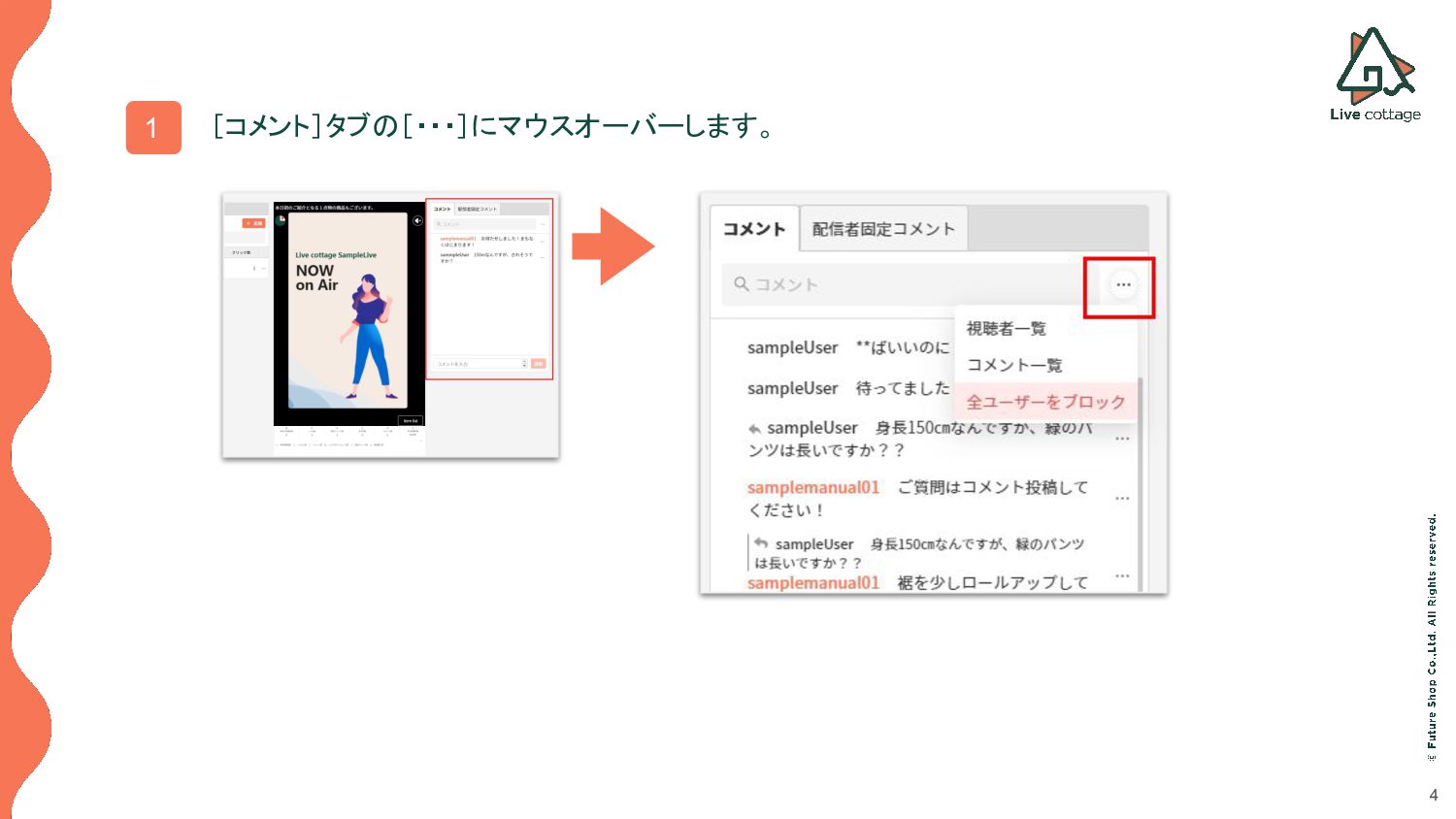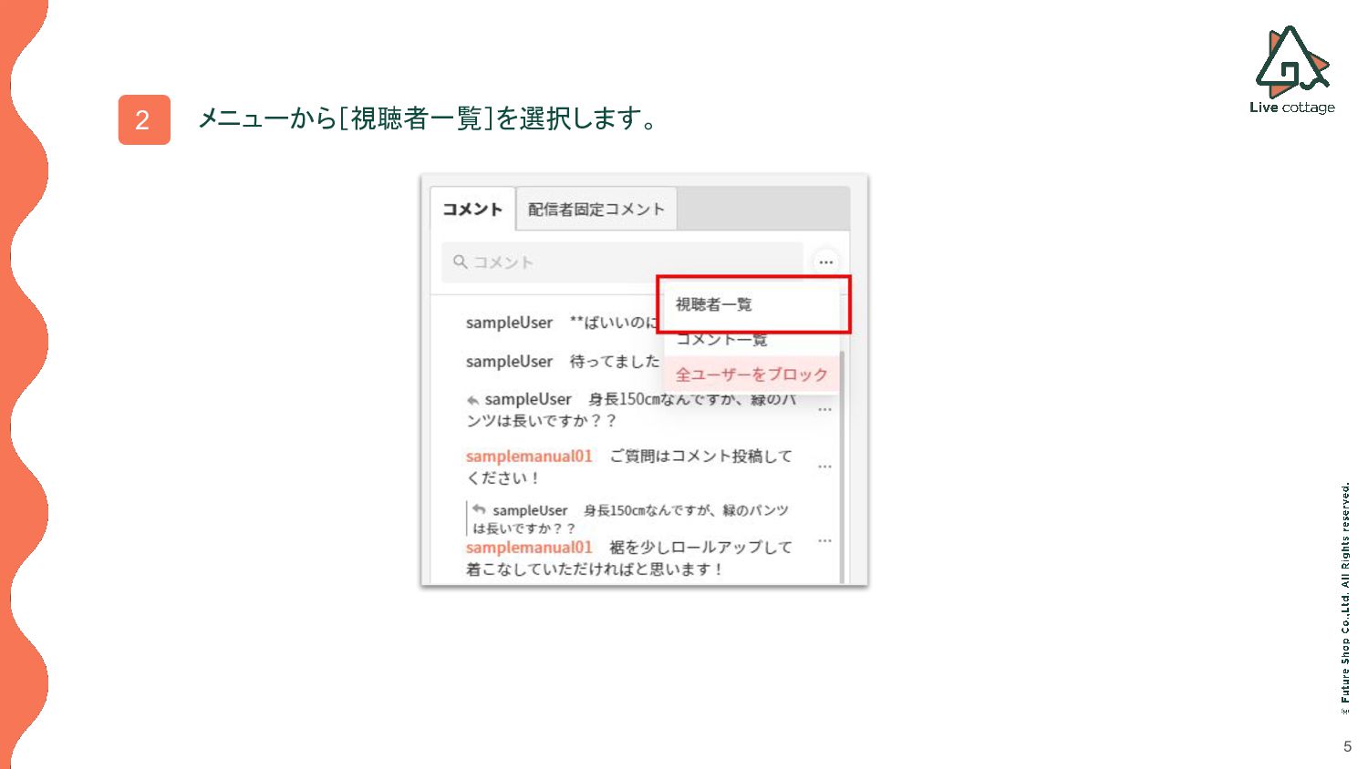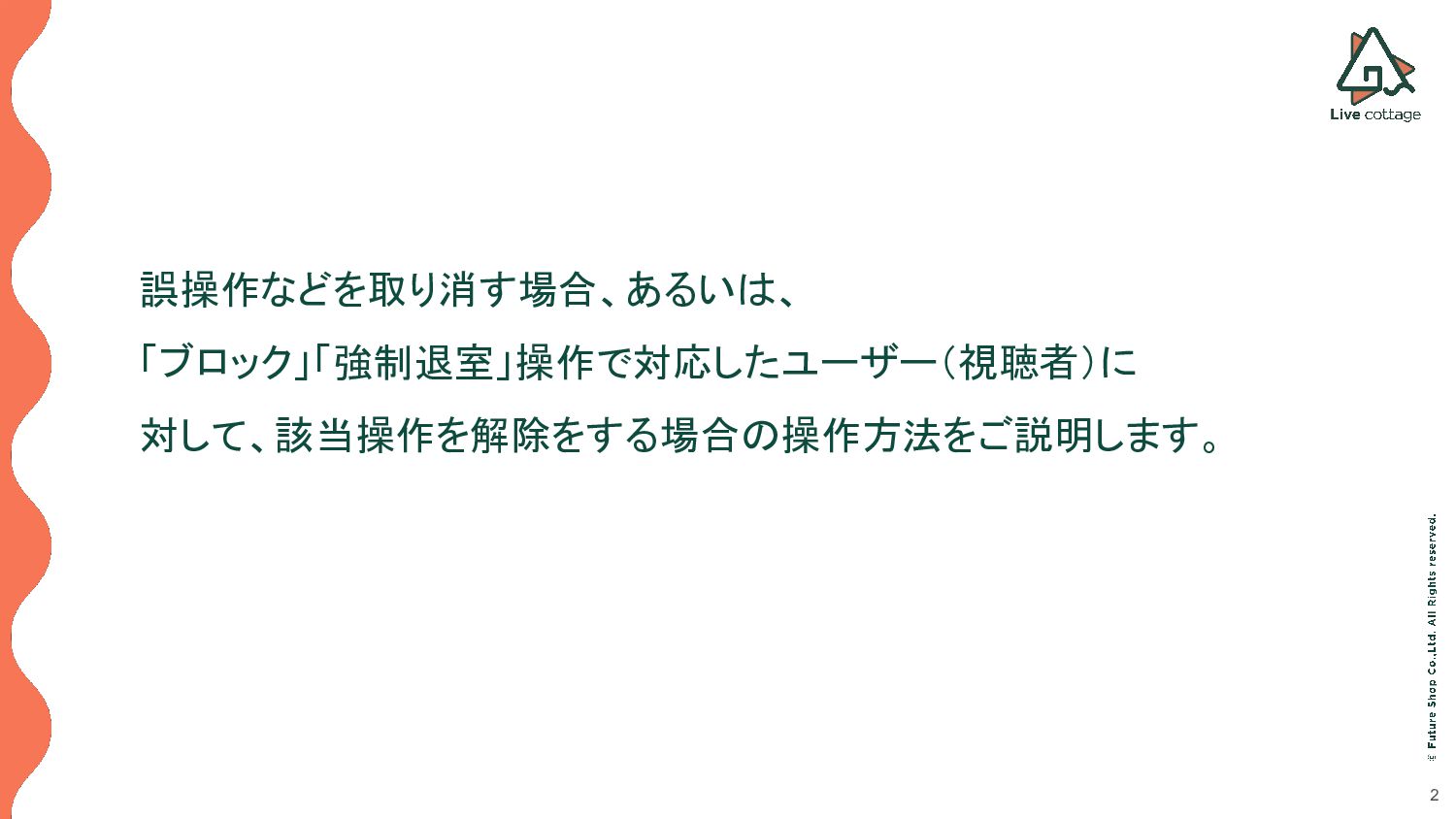 2 誤操作などを取り消す場合、あるいは、 「ブロック」「強制退室」操作で対応したユーザー(視聴者)に 対して、該当操作を解除をする場合の操作方法をご説明します。