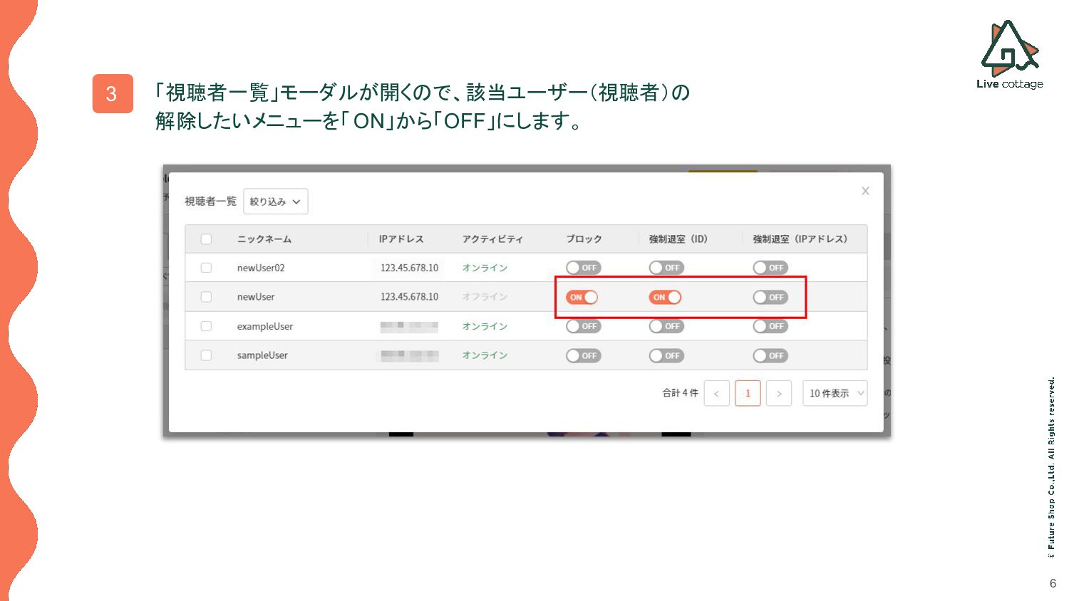 6 3 「視聴者一覧」モーダルが開くので、該当ユーザー(視聴者)の 解除したいメニューを「 ON」から「OFF」にします。
