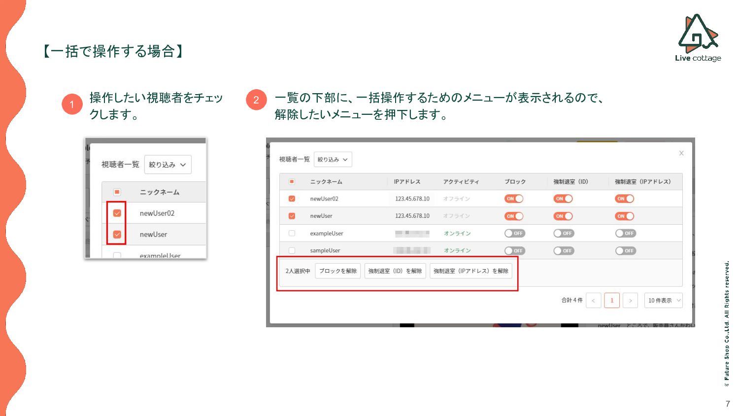 7 【一括で操作する場合】 操作したい視聴者をチェッ クします。 一覧の下部に、一括操作するためのメニューが表示されるので、 解除したいメニューを押下します。 1 2