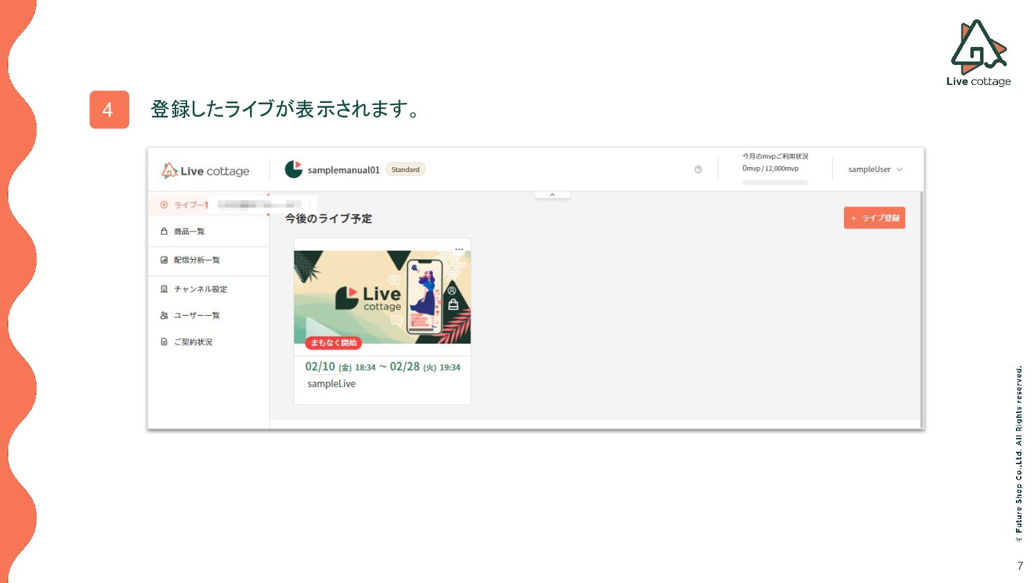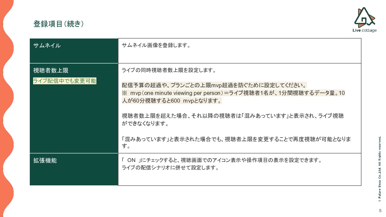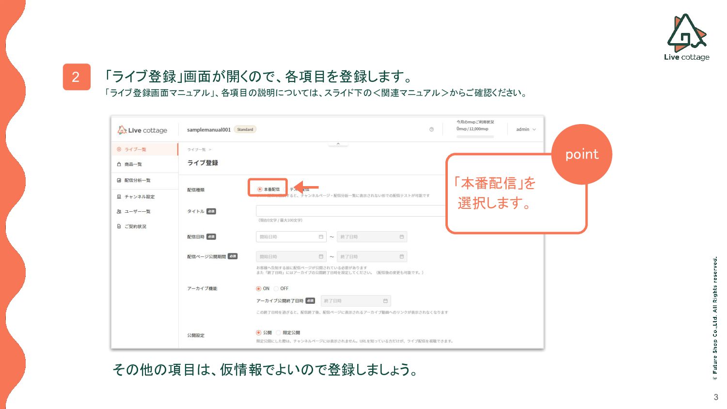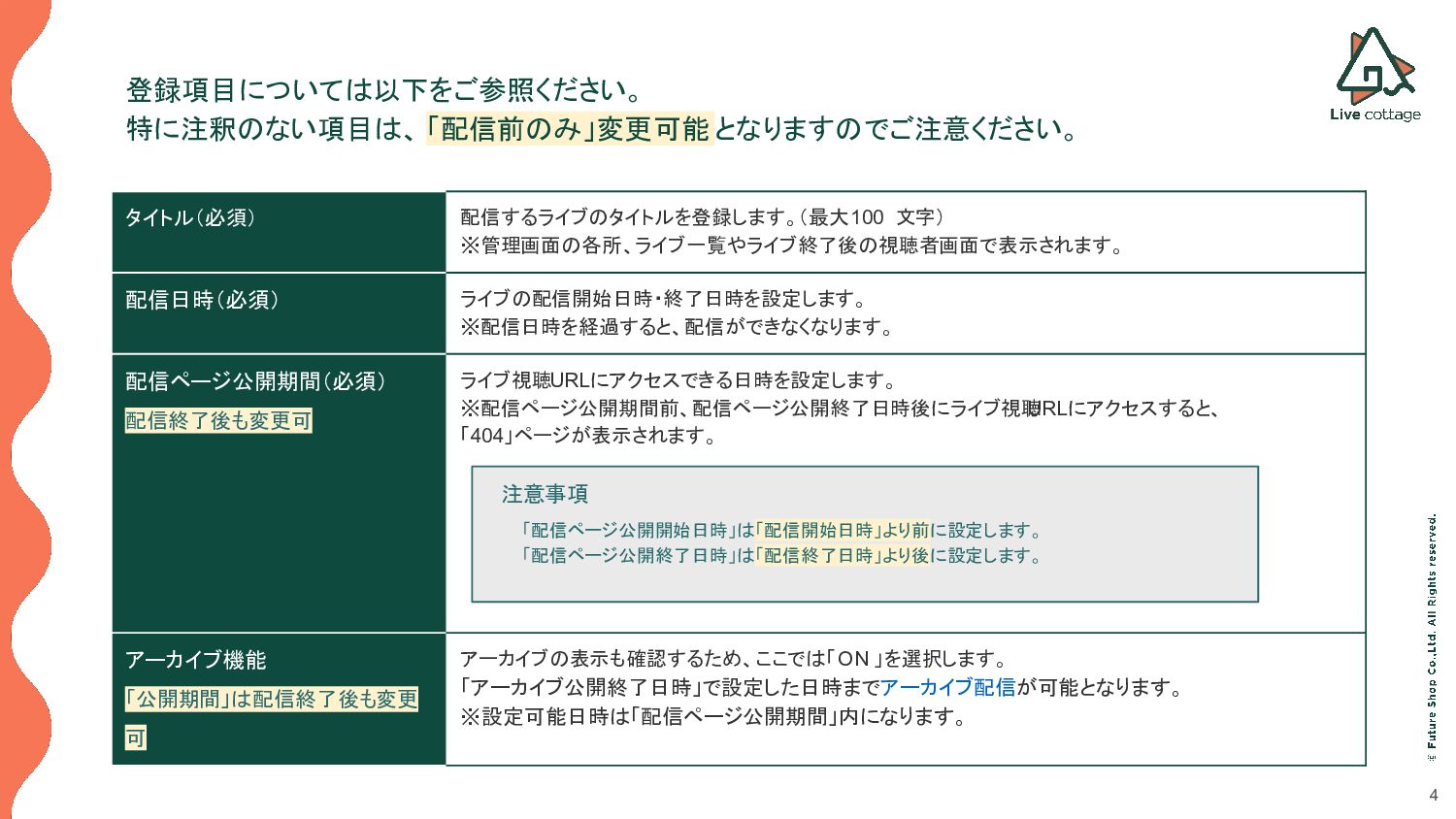 配信日時(必須) ライブの配信開始日時・終了日時を設定します。 ※配信日時を経過すると、配信ができなくなります。 配信ページ公開期間(必須) 配信終了後も変更可 ライブ視聴URLにアクセスできる日時を設定します。 ※配信ページ公開期間前、配信ページ公開終了日時後にライブ視聴 URLにアクセスすると、 「404」ページが表示されます。 アーカイブ機能 「公開期間」は配信終了後も変更 可 アーカイブの表示も確認するため、ここでは「 ON 」を選択します。 「アーカイブ公開終了日時」で設定した日時までアーカイブ配信が可能となります。 ※設定可能日時は「配信ページ公開期間」内になります。 注意事項 「配信ページ公開開始日時」は「配信開始日時」より前に設定します。 「配信ページ公開終了日時」は「配信終了日時」より後に設定します。