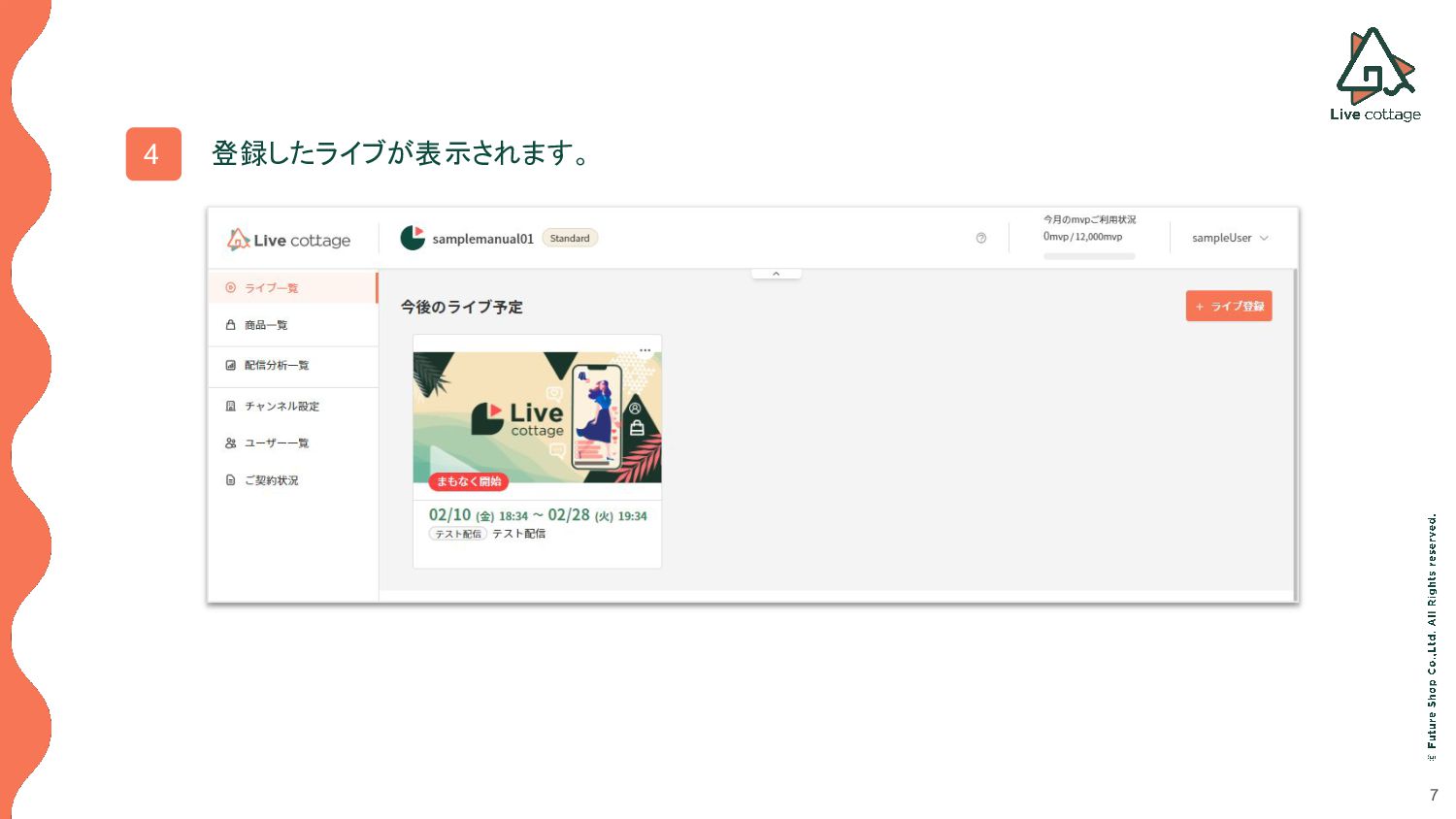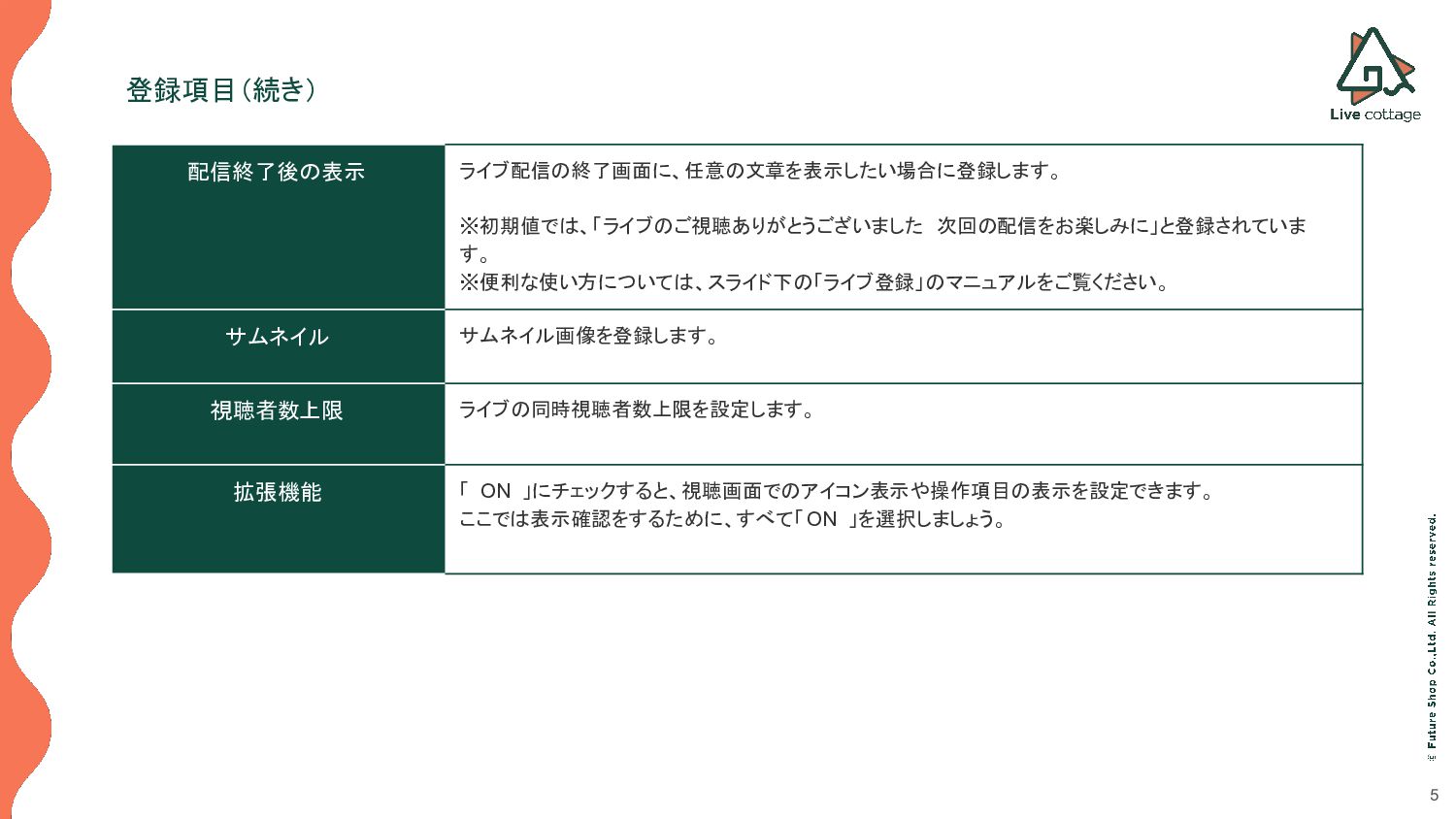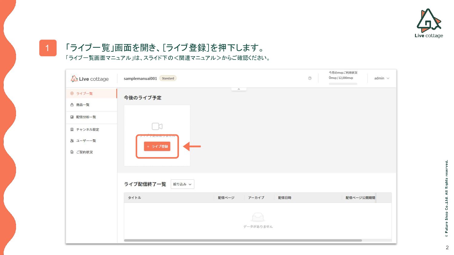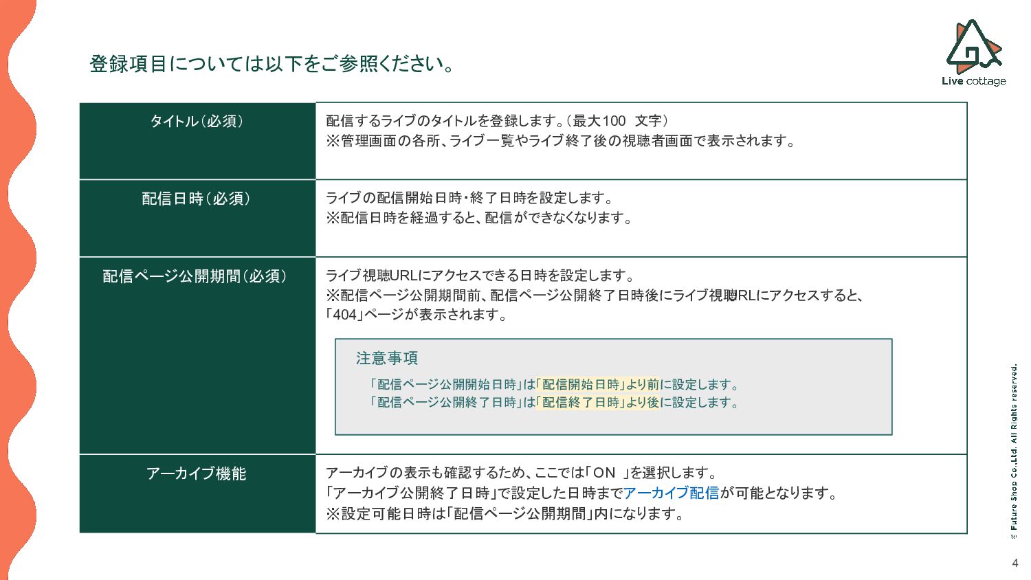 ※配信日時を経過すると、配信ができなくなります。 配信ページ公開期間(必須) ライブ視聴URLにアクセスできる日時を設定します。 ※配信ページ公開期間前、配信ページ公開終了日時後にライブ視聴 URLにアクセスすると、 「404」ページが表示されます。 アーカイブ機能 アーカイブの表示も確認するため、ここでは「 ON 」を選択します。 「アーカイブ公開終了日時」で設定した日時までアーカイブ配信が可能となります。 ※設定可能日時は「配信ページ公開期間」内になります。 注意事項 「配信ページ公開開始日時」は「配信開始日時」より前に設定します。 「配信ページ公開終了日時」は「配信終了日時」より後に設定します。
