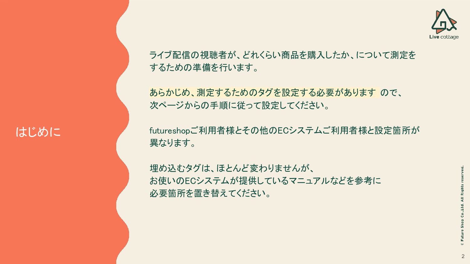 2 はじめに ライブ配信の視聴者が、どれくらい商品を購入したか、について測定を するための準備を行います。 あらかじめ、測定するためのタグを設定する必要があります ので、 次ページからの手順に従って設定してください。