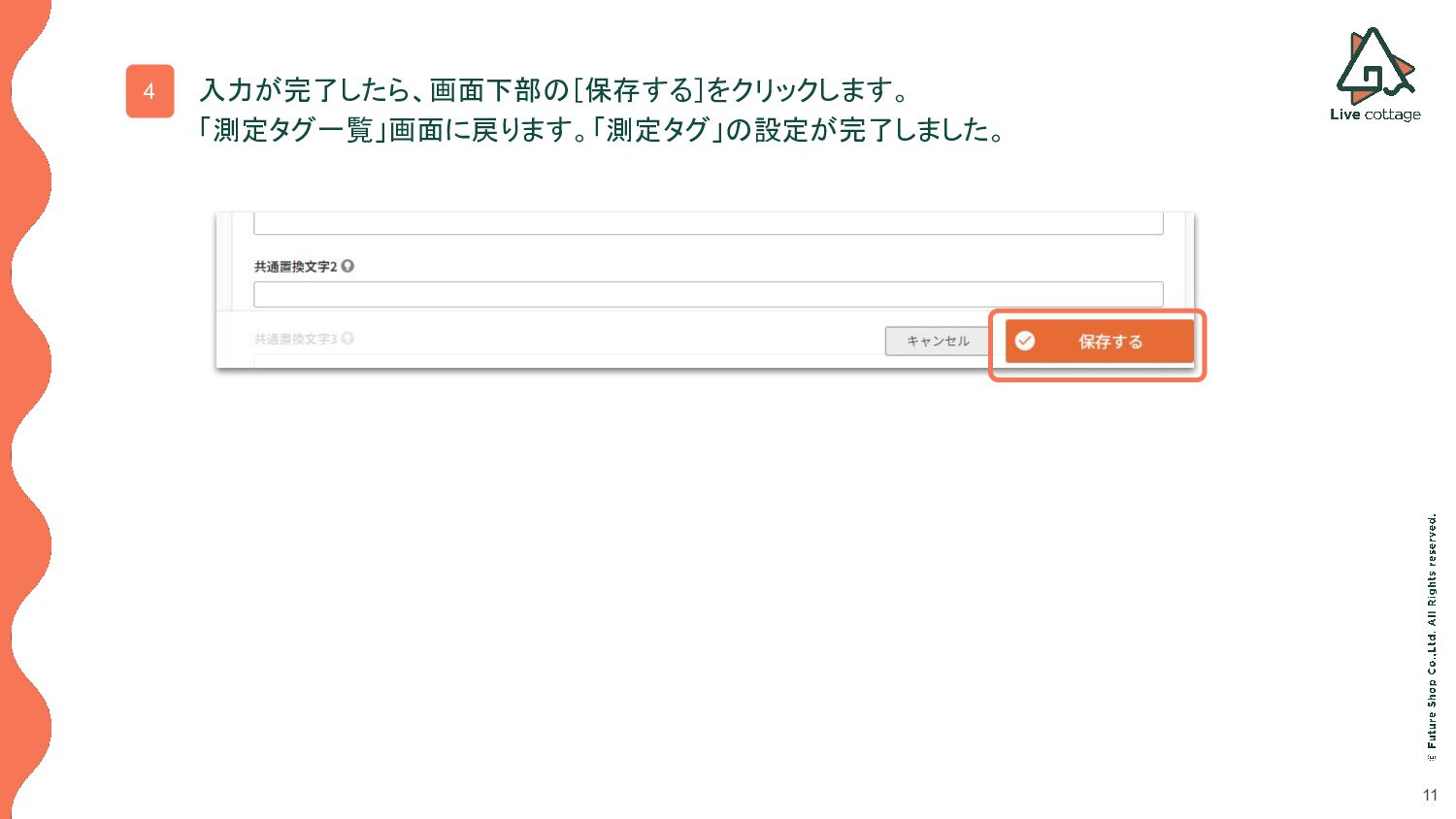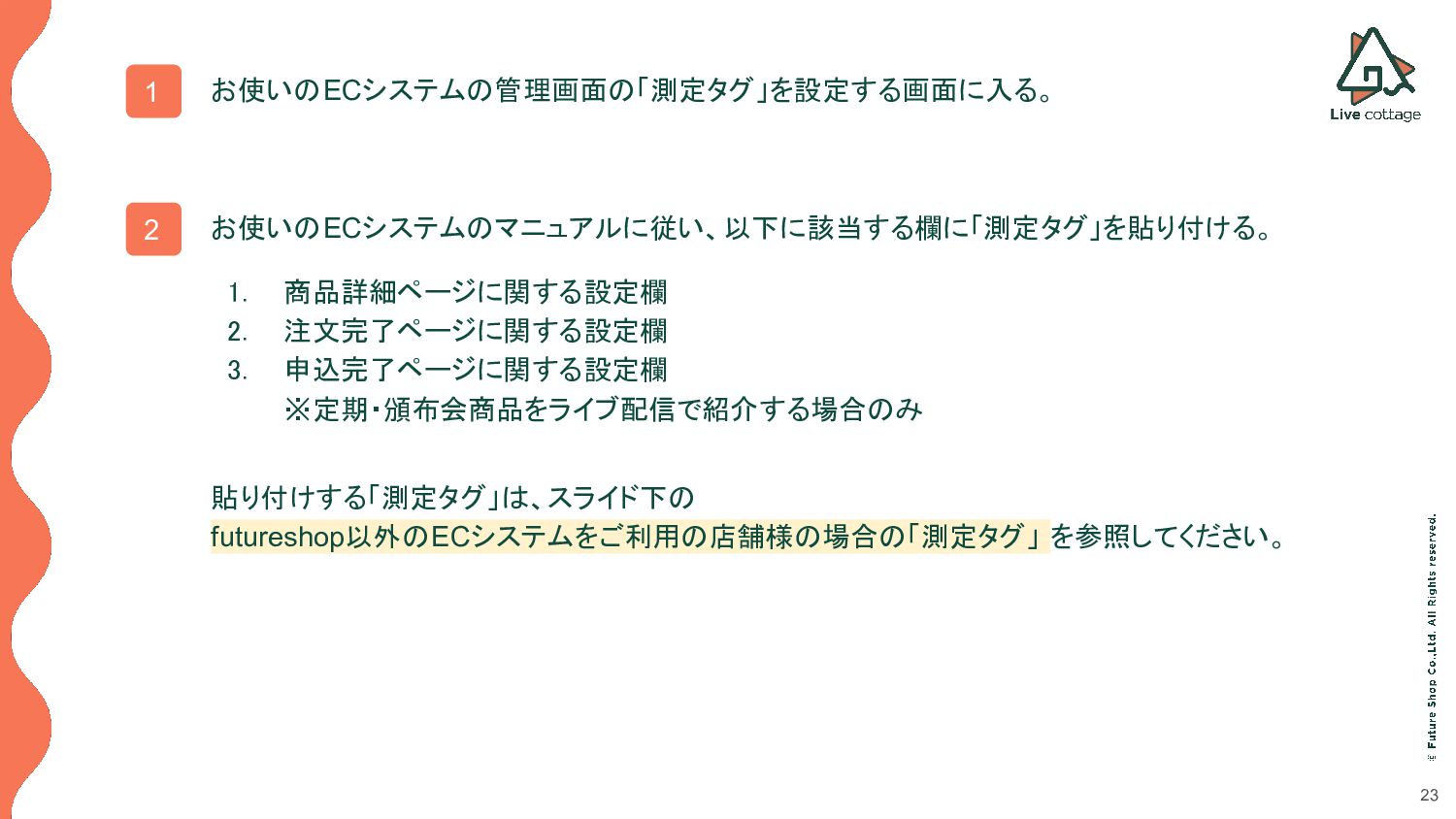 3. 申込完了ページに関する設定欄 ※定期・頒布会商品をライブ配信で紹介する場合のみ 貼り付けする「測定タグ」は、スライド下の futureshop以外のECシステムをご利用の店舗様の場合の「測定タグ」 を参照してください。