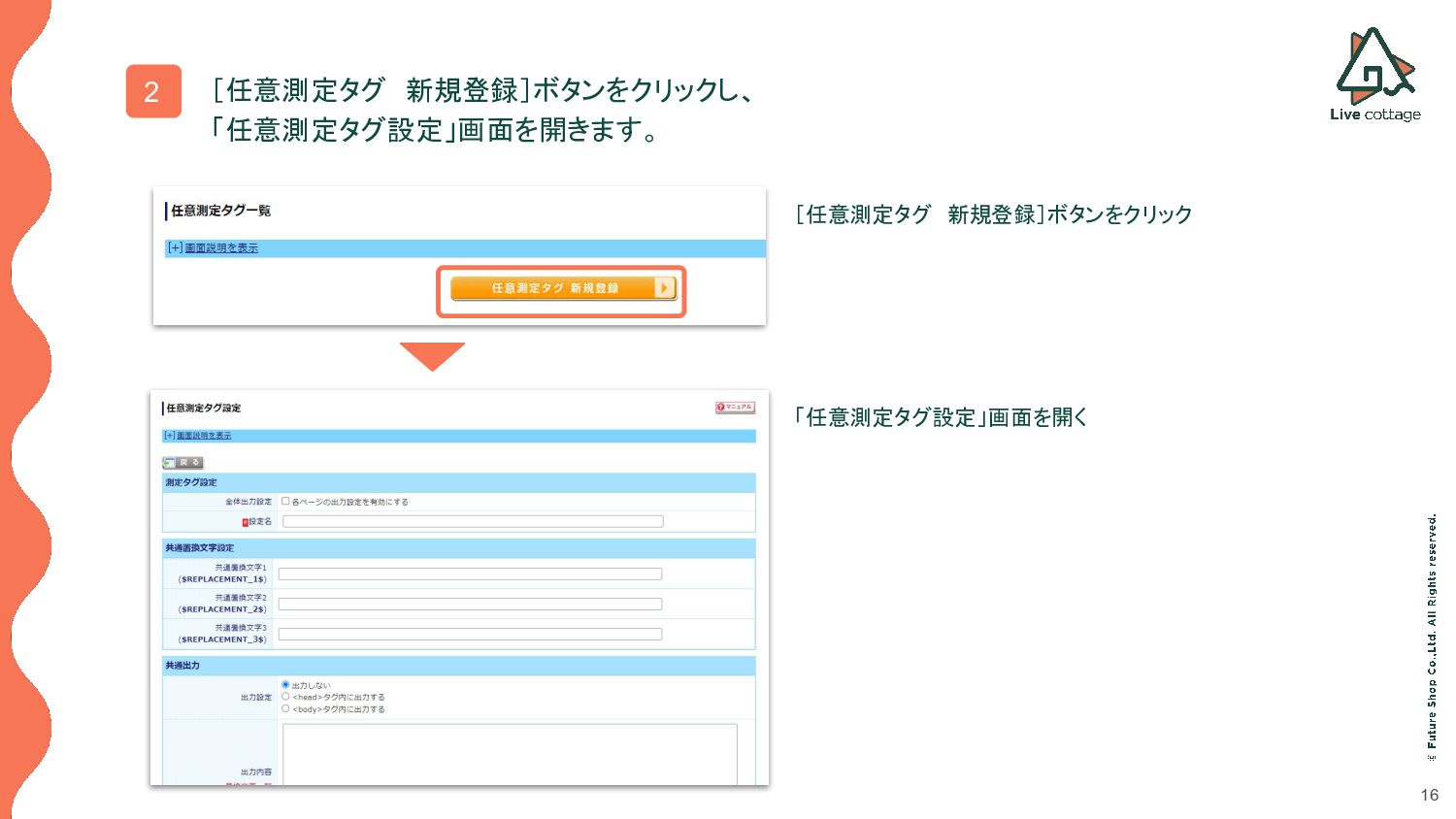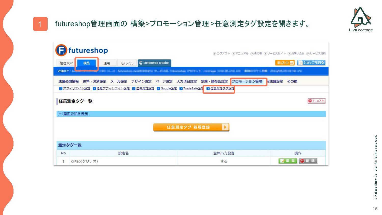 15 1 futureshop管理画面の 構築>プロモーション管理>任意測定タグ設定を開きます。