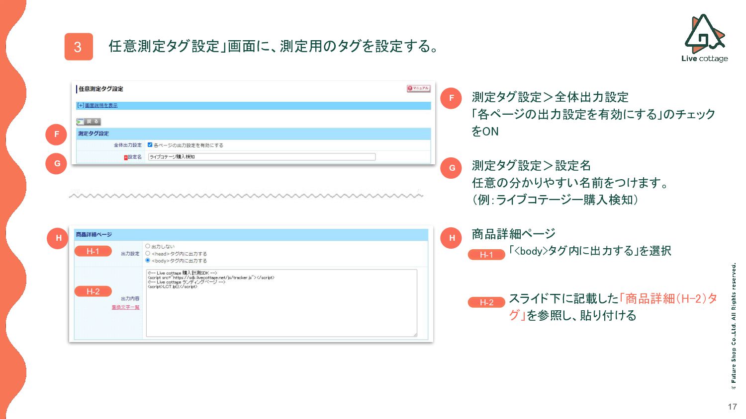 任意の分かりやすい名前をつけます。 (例:ライブコテージー購入検知) • 商品詳細ページ ◦ 「<body>タグ内に出力する」を選択 ◦ スライド下に記載した「商品詳細(H-2)タ グ」を参照し、貼り付ける G F F H G H H-1 H-2 H-1 H-2