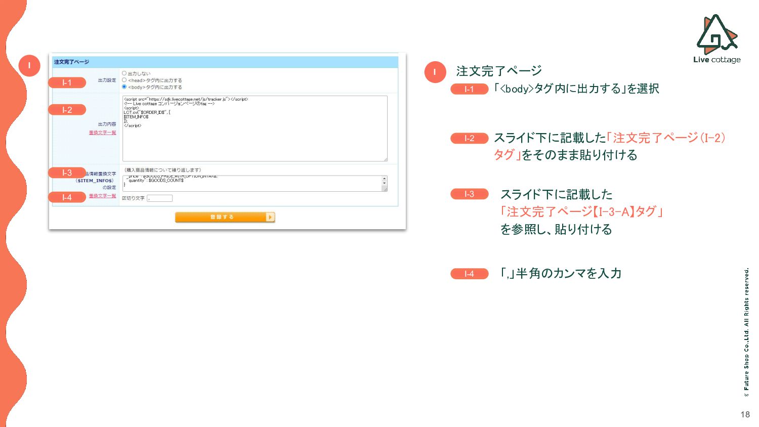 ◦ スライド下に記載した「注文完了ページ(I-2) タグ」をそのまま貼り付ける I I-1 I-2 I-3 I-4 「,」半角のカンマを入力 スライド下に記載した 「注文完了ページ【I-3-A】タグ」 を参照し、貼り付ける