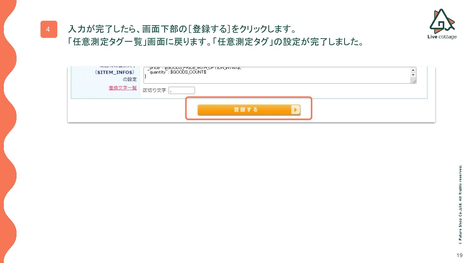 「<body>タグ内(<body>タグの後)に出力す る」を選択 ◦ スライド下に記載した申込完了ページ (E-2)タグ」をそのまま貼り付ける E E-1 E-2 E-3 E-4 「,」半角のカンマを入力 スライド下に記載した 「注文完了ページ【E-3-A】タグ」 を参照し、貼り付ける
