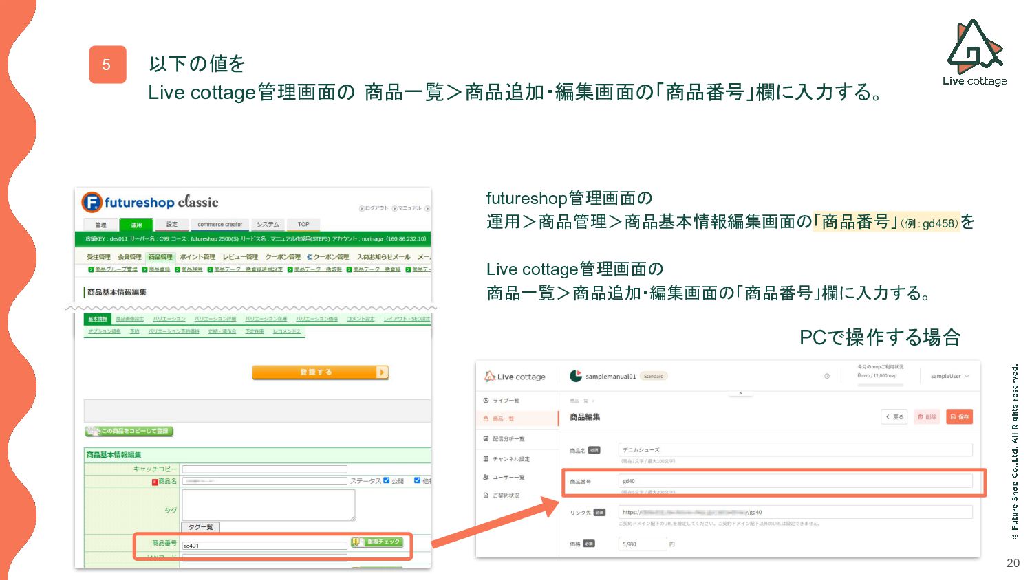 20 5 PCで操作する場合 futureshop管理画面の 運用>商品管理>商品基本情報編集画面の「商品番号」(例:gd458)を Live cottage管理画面の 商品一覧>商品追加・編集画面の「商品番号」欄に入力する。 以下の値を Live