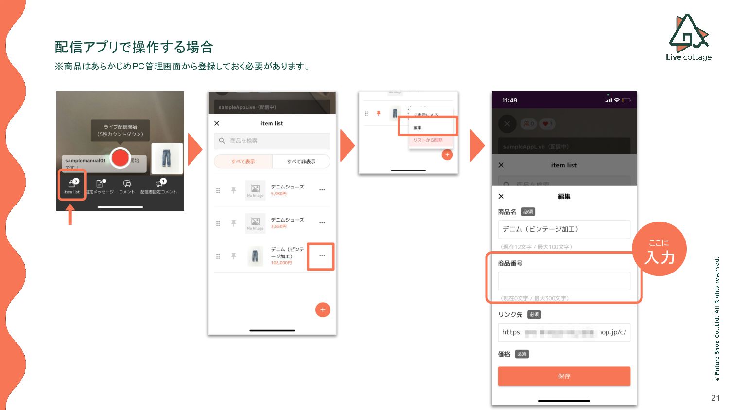 21 配信アプリで操作する場合 ※商品はあらかじめPC管理画面から登録しておく必要があります。 ここに 入力