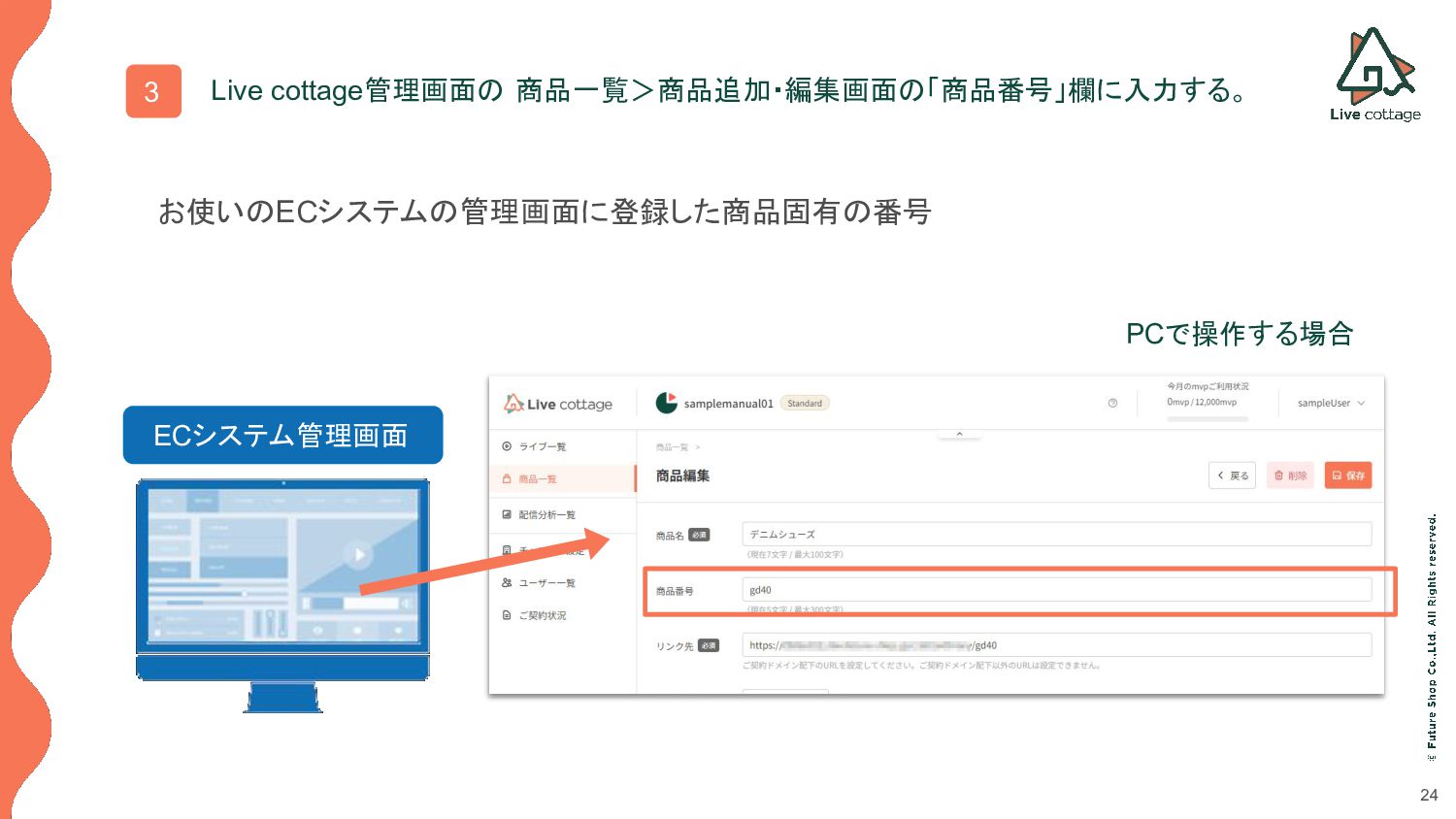 24 3 ECシステム管理画面 PCで操作する場合 Live cottage管理画面の 商品一覧>商品追加・編集画面の「商品番号」欄に入力する。 お使いのECシステムの管理画面に登録した商品固有の番号