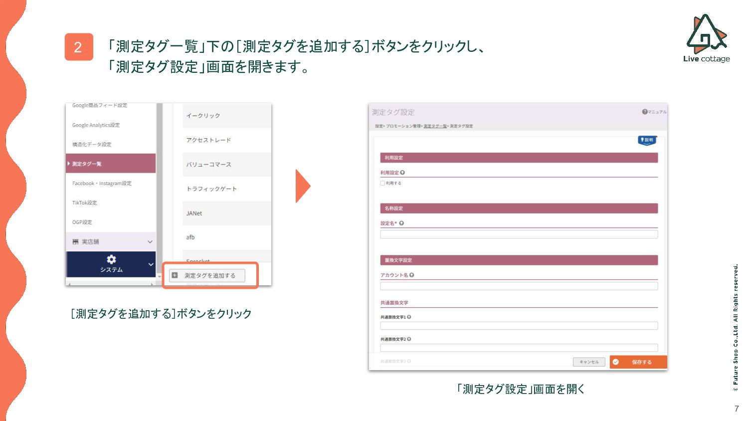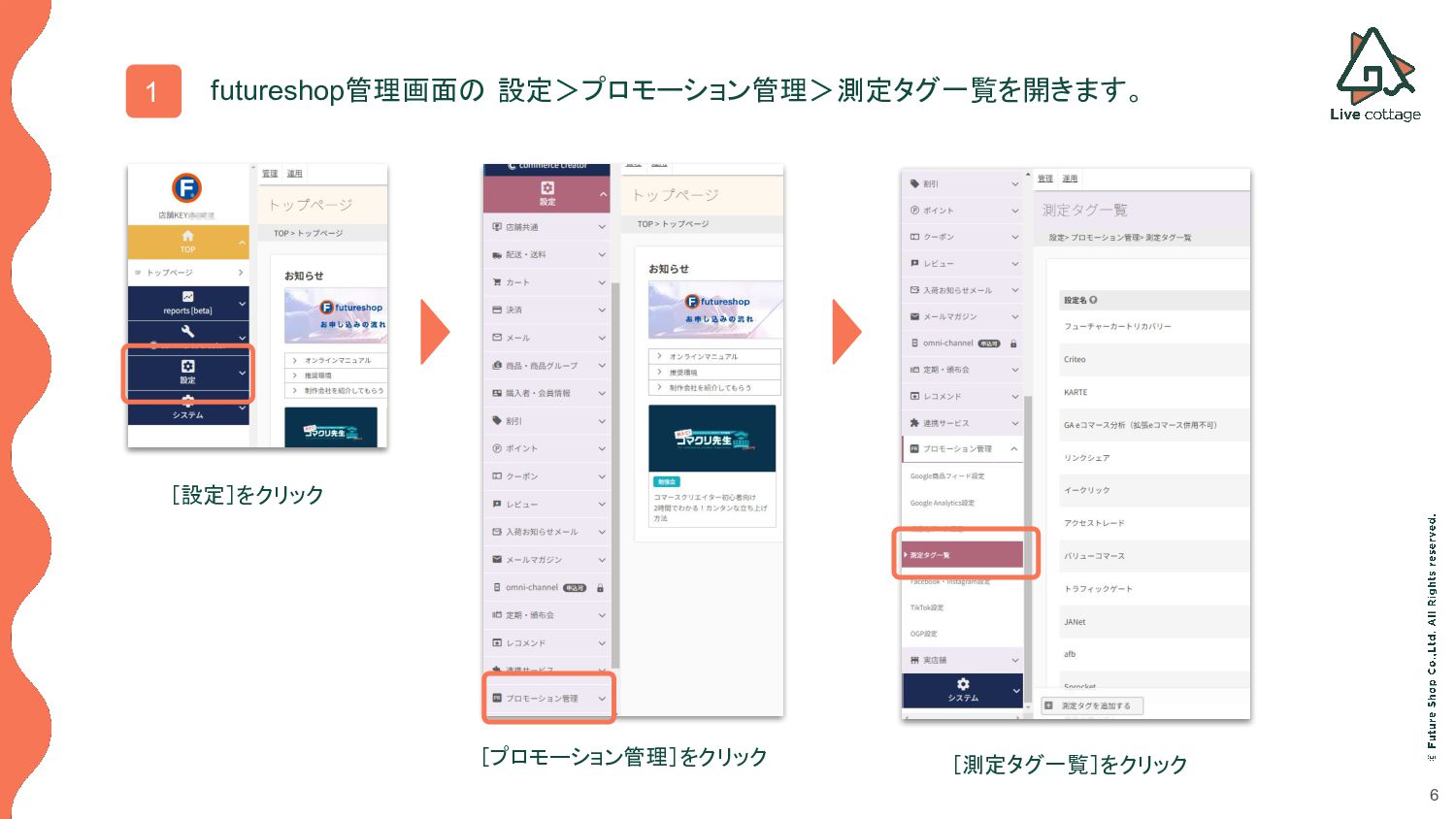 6 1 futureshop管理画面の 設定>プロモーション管理>測定タグ一覧を開きます。 [設定]をクリック [プロモーション管理]をクリック [測定タグ一覧]をクリック