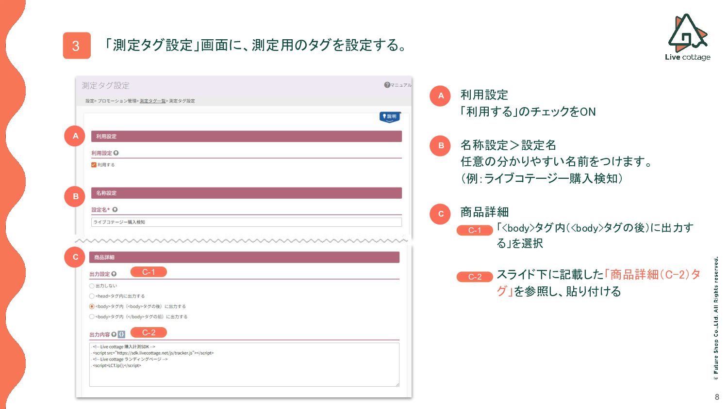 (例:ライブコテージー購入検知) • 商品詳細 ◦ 「<body>タグ内(<body>タグの後)に出力す る」を選択 ◦ スライド下に記載した「商品詳細(C-2)タ グ」を参照し、貼り付ける B A A C B C C-1 C-2 C-1 C-2