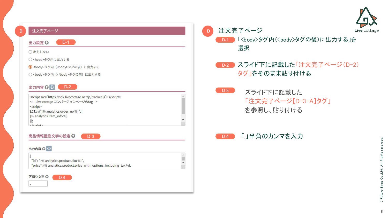D D D-1 D-2 D-3 D-4 D-1 D-2 D-3 D-4 スライド下に記載した 「注文完了ページ【D-3-A】タグ」 を参照し、貼り付ける 「,」半角のカンマを入力