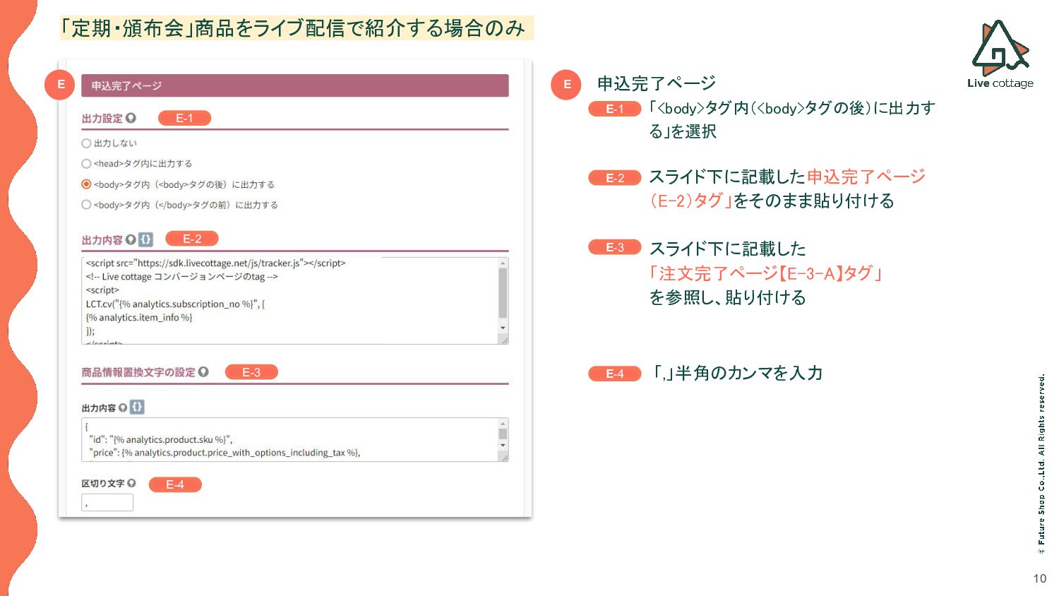 10 E E-1 E-2 E-3 E-4 「定期・頒布会」商品をライブ配信で紹介する場合のみ • 申込完了ページ ◦