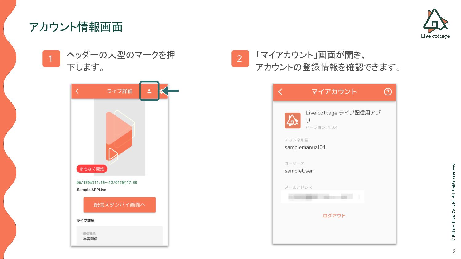 2 アカウント情報画面 ヘッダーの人型のマークを押 下します。 1 「マイアカウント」画面が開き、 アカウントの登録情報を確認できます。