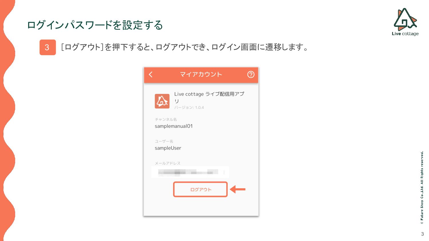 3 ログインパスワードを設定する [ログアウト]を押下すると、ログアウトでき、ログイン画面に遷移します。 3