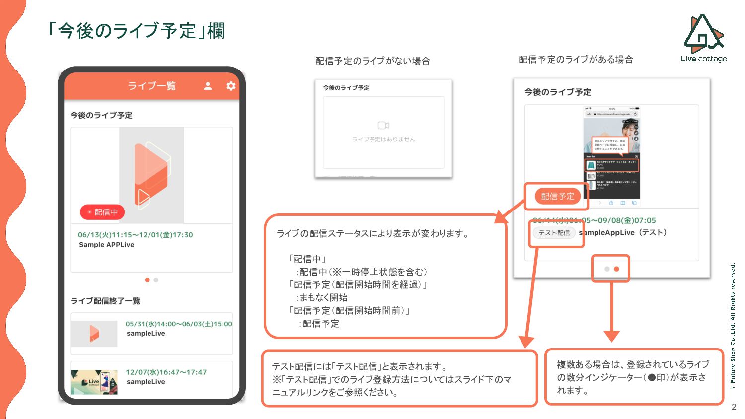 ※「テスト配信」でのライブ登録方法についてはスライド下のマ ニュアルリンクをご参照ください。 ライブの配信ステータスにより表示が変わります。 「配信中」 :配信中(※一時停止状態を含む) 「配信予定(配信開始時間を経過)」 :まもなく開始 「配信予定(配信開始時間前)」 :配信予定