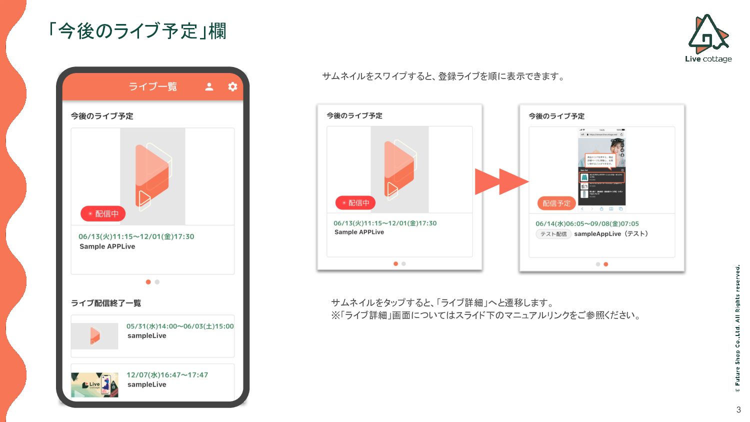 3 「今後のライブ予定」欄 サムネイルをスワイプすると、登録ライブを順に表示できます。 サムネイルをタップすると、「ライブ詳細」へと遷移します。 ※「ライブ詳細」画面についてはスライド下のマニュアルリンクをご参照ください。
