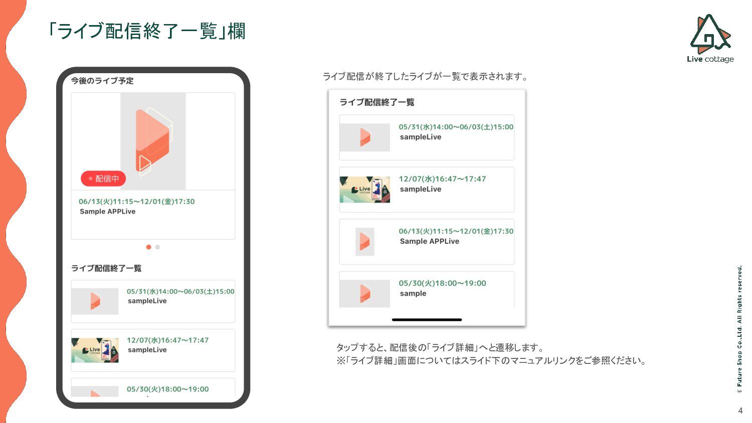 4 「ライブ配信終了一覧」欄 ライブ配信が終了したライブが一覧で表示されます。 タップすると、配信後の「ライブ詳細」へと遷移します。 ※「ライブ詳細」画面についてはスライド下のマニュアルリンクをご参照ください。