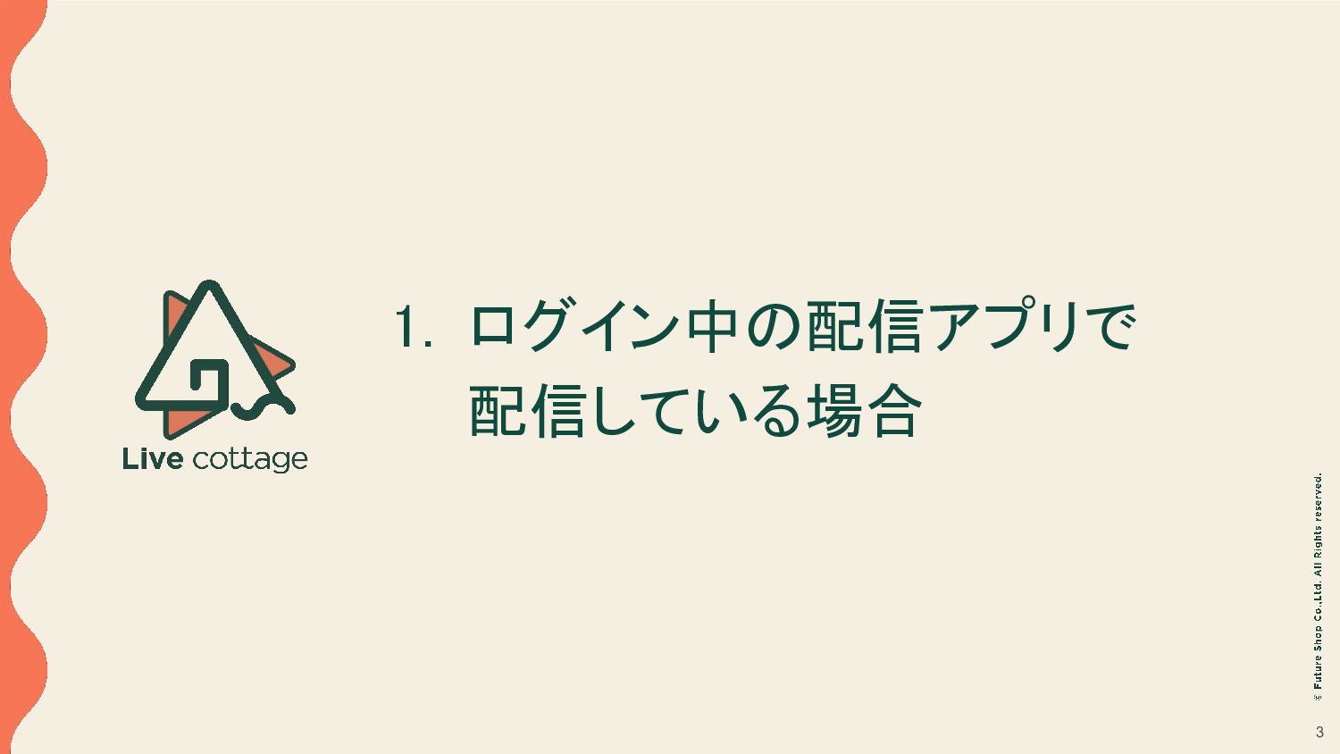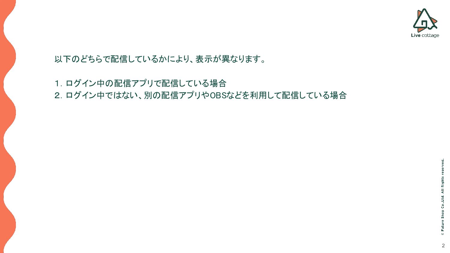 2 以下のどちらで配信しているかにより、表示が異なります。 1.ログイン中の配信アプリで配信している場合 2.ログイン中ではない、別の配信アプリやOBSなどを利用して配信している場合
