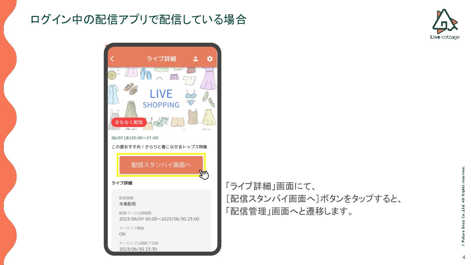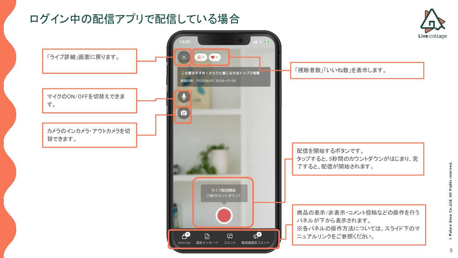 商品の表示/非表示・コメント投稿などの操作を行う パネルが下から表示されます。 ※各パネルの操作方法については、スライド下のマ ニュアルリンクをご参照ください。 配信を開始するボタンです。 タップすると、5秒間のカウントダウンがはじまり、完 了すると、配信が開始されます。