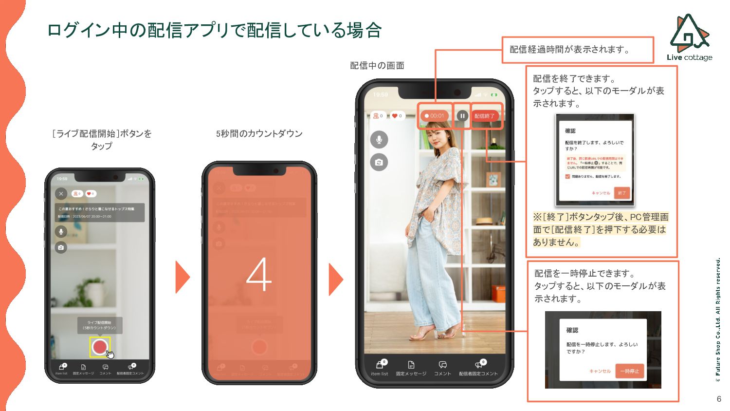 6 ログイン中の配信アプリで配信している場合 [ライブ配信開始]ボタンを タップ 5秒間のカウントダウン 配信経過時間が表示されます。 配信を一時停止できます。 タップすると、以下のモーダルが表 示されます。